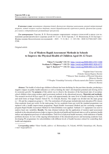 3. Горелик В.В. Состояние регуляторных систем школьников в условиях применения разных режимов двигательной активности на занятиях физической культурой // Вектор науки Тольят. гос. ун-та. 2013. No 1 (23). С. 31-35. EDN: REHWPT
