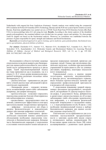 Материалы и методы. В исследовании приняли участие студенты Волгоградской государственной академии физической культуры в возрасте от 16 до 23 лет, занимающиеся легкой атлетикой (n = 22, средний возраст - 19,5 года, стаж занятий - 6-10 лет, средняя частота тренировок - 5-7 занятий в неделю, продолжительность - по 3 ч). Биохимические показатели сыворотки крови измерялись на автоматическом биохимическом анализаторе Selectra ProM (Vital Scientific B. V., Elitech Holding, Нидерланды) с помощью наборов реактивов фирмы Analyticon (Германия). Исследование генетических маркеров проводилось с применением коммерческого набора для выделения ДНК «Проба-ГС-Генетика» (ООО «ДНК-Технология», Россия) и ПЦР-тест-системы «Спортивная генетика» (НПФ «Литех», Россия). Амплификация в режиме реального времени осуществлялась на термоциклере CFX96 Touch Real-Time PCR Detection System (Bio-Rad, США) в микроцентрифужных пробирках (0,2 мл) с использованием «горячего старта».