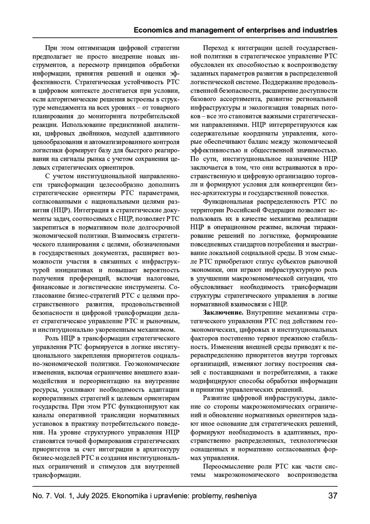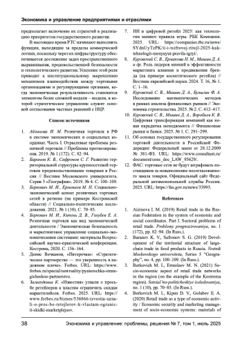 Выводы: а) трансформация управления осуществляется за счет цифровизации бизнес-процессов, интеграции нормативных ограничений и локализации ресурсных связей; б) стратегическая гибкость формируется внутри гибридных моделей, синхронизированных с параметрами поведения потребителей и государственной политикой; в) институциональная встраиваемость стратегий расширяет границы воспроизводства и закрепляет роль торговых сетей в реализации национальных целей развития.