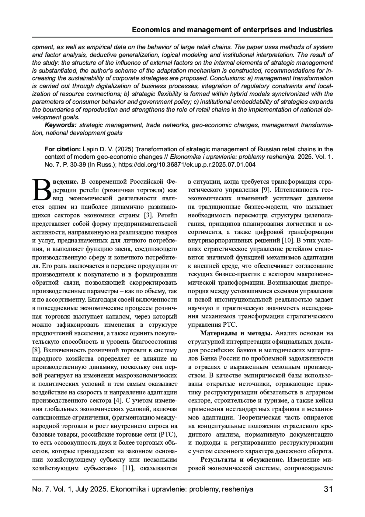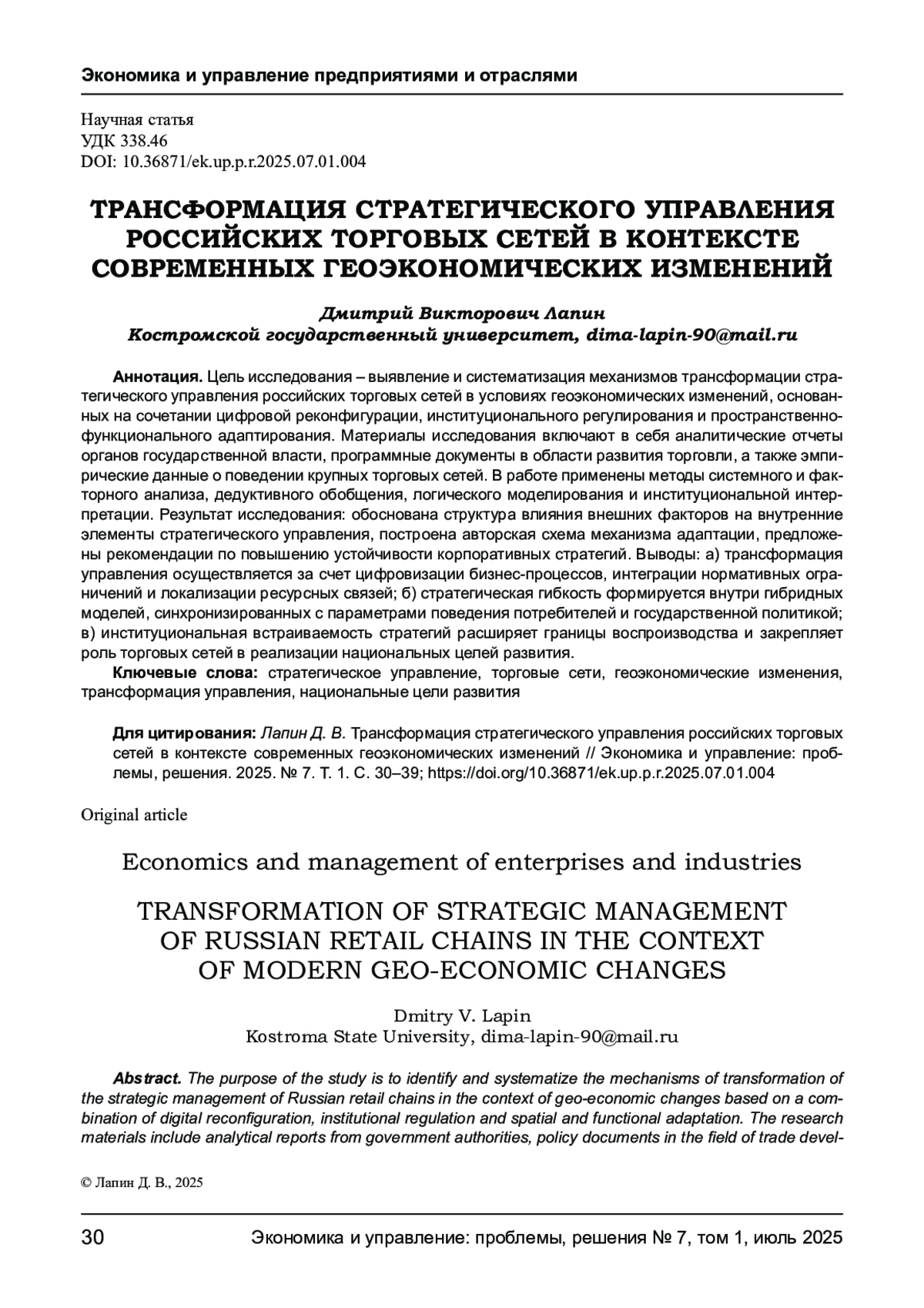 Цель исследования - выявление и систематизация механизмов трансформации стратегического управления российских торговых сетей в условиях геоэкономических изменений, основанных на сочетании цифровой реконфигурации, институционального регулирования и пространственно-функционального адаптирования. Материалы исследования включают в себя аналитические отчеты органов государственной власти, программные документы в области развития торговли, а также эмпирические данные о поведении крупных торговых сетей. В работе применены методы системного и факторного анализа, дедуктивного обобщения, логического моделирования и институциональной интерпретации.