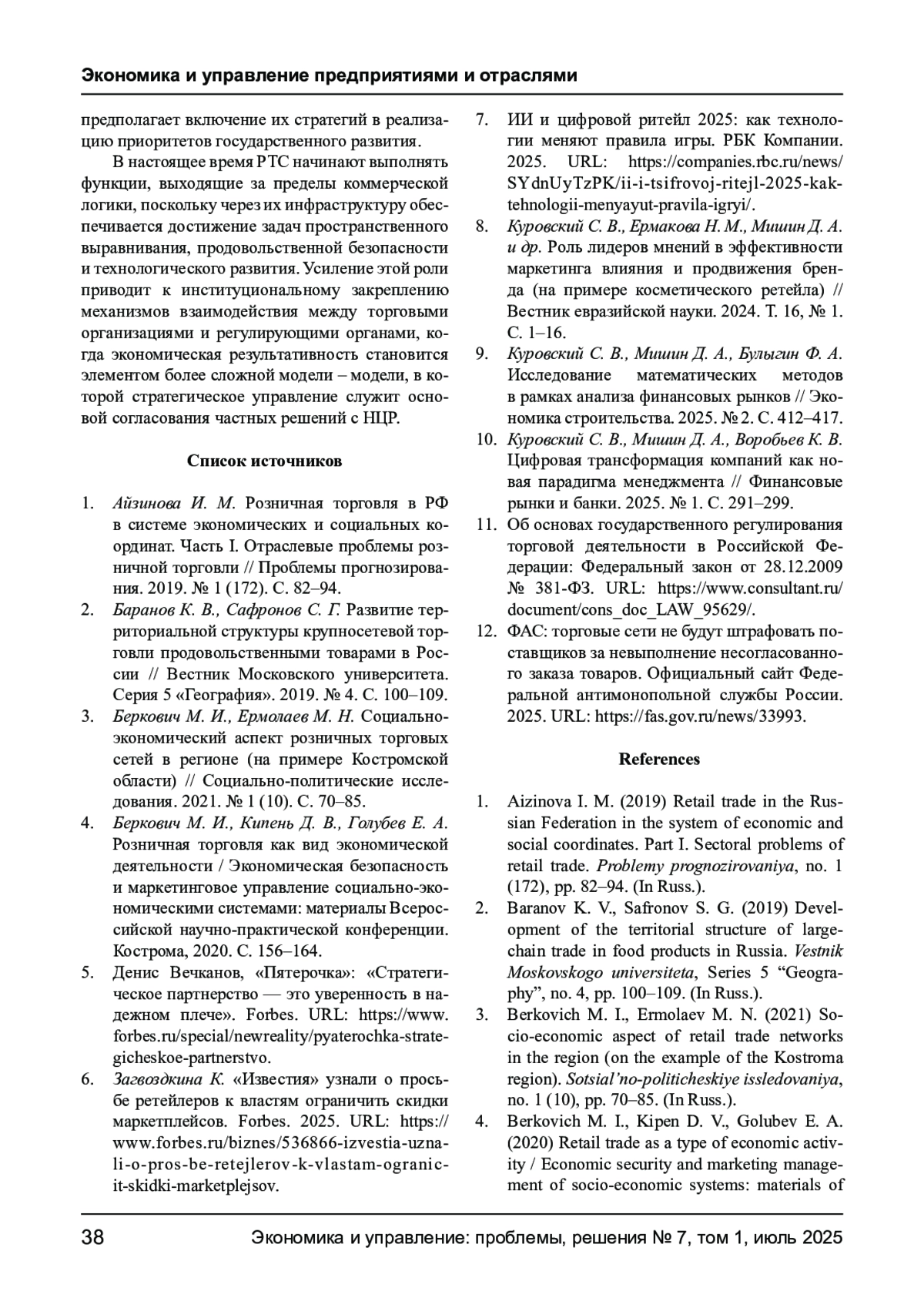 1. Айзинова И. М. Розничная торговля в РФ в системе экономических и социальных координат. Часть I. Отраслевые проблемы розничной торговли // Проблемы прогнозирования. 2019. № 1 (172). С. 82-94.