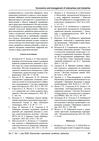 1. Бондарева И. О., Белова А. О. Риск-ориентированная онтологическая модель поддержки принятия управленческих решений в грузовом порту на основе многоуровневого целеполагания // Вестник Астраханского государственного технического университета. Серия “Управление, вычислительная техника и информатика”. 2024. № 1. С. 88-99. EDN: VZDUVS