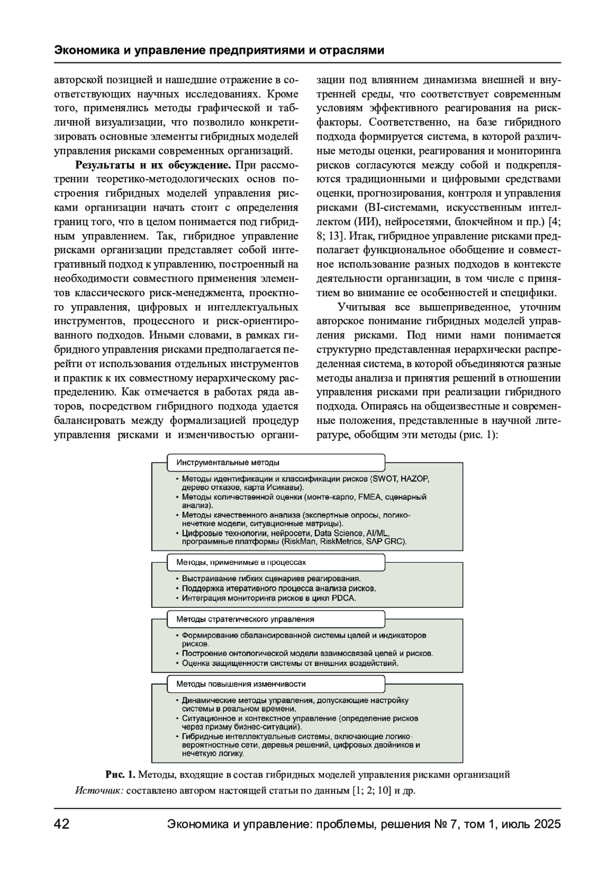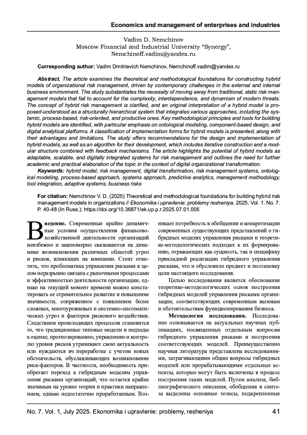 В статье рассматриваются теоретико-методологические основания построения гибридных моделей управления рисками организаций, обусловленные современными вызовами внешней и внутренней среды функционирования бизнеса. Обосновывается необходимость отказа от традиционных, статичных моделей управления рисками, не способных учитывать сложность, взаимозависимость и динамичность современных угроз. В рамках исследования уточняется понятие гибридного управления рисками, предлагается авторская трактовка гибридной модели как структурно иерархически выстроенной системы, объединяющей различные подходы - системный, процессный, риск-ориентированный и продуктивный. Определены ведущие методологические основания и инструменты построения гибридных моделей, среди которых уточнены: онтологическое моделирование, компонентное проектирование и цифровые аналитические платформы. Проведена классификация форм реализации гибридных моделей, выделены их преимущества и ограничения. Представлены рекомендации по проектированию и внедрению гибридных моделей, а также алгоритм их построения, предполагающий итеративное построение и формирование модульной структуры вкупе с применением механизмов обратной связи. Выделяется перспективность развития гибридных моделей в качестве изменяемых, масштабируемых и цифровых интегрированных систем управления рисками. Уточняются положения, связанные с необходимостью дальнейшей научной и прикладной проработки вопроса в условиях цифровой трансформации организаций.