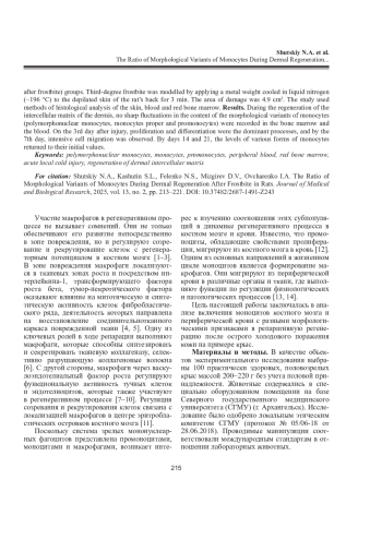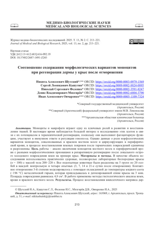Моноциты и макрофаги играют одну из ключевых ролей в развитии и восстановлении тканей. В настоящее время наблюдается большой интерес к исследованию этих клеток в связи с их потенциалом в терапевтической регенерации, поскольку они выполняют фагоцитарную функцию, участвуют в иммунном ответе и регуляции гемопоэза. Однако данные о роли морфологических вариантов моноцитов, локализованных в красном костном мозге и циркулирующих в периферической крови, в процессе восстановления кожных покровов после термических повреждений единичны и разрозненны.