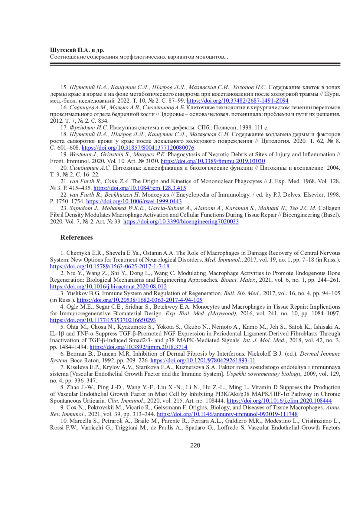 15. Шутский Н.А., Кашутин С.Л., Шагров Л.Л., Малявская С.И., Холопов Н.С. Содержание клеток в зонах дермы крыс в норме и на фоне метаболического синдрома при восстановлении после холодовой травмы // Журн. мед.-биол. исследований. 2022. Т. 10, No 2. С. 87-99. DOI: 10.37482/2687-1491-Z094 EDN: HCPZDC