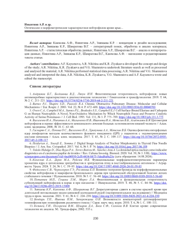 Метод компьютерной морфометрии позволяет детально изучать как морфометрические особенности нейтрофилов, так и их оптические свойства. Показатель преломления компонентов цитоплазмы непосредственно зависит от ее гранулированности, наличия или отсутствия органелл и включений, а показатель преломления хроматина - от его структурной упорядоченности. С учетом этого морфометрические и оптические показатели можно использовать в качестве характеристик функциональной и метаболической активности нейтрофильных лейкоцитов при воздействии неблагоприятных факторов среды на организм.