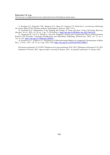8. Колесник Е.А., Дерхо М.А., Ребезов М.Б. Функциональные морфоденситометрические параметры хроматина ядра и цитоплазмы эритробластов и эритроцитов птиц в постэмбриональном онтогенезе // Аграр. вестн. Урала. 2024. Т. 24, No 1. С. 59-85. DOI: 10.32417/1997-4868-2024-24-01-59-85 EDN: MYWOZF