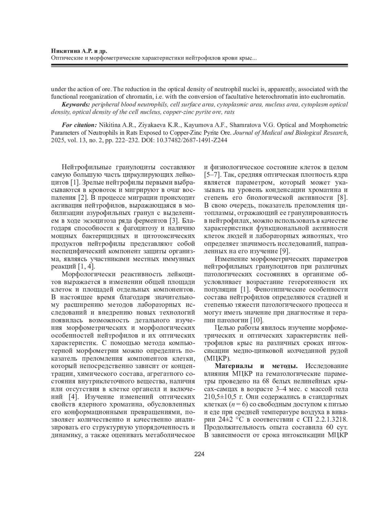 Материалы и методы. В эксперименте использовались 68 нелинейных крыс-самцов 3-4-месячного возраста (средняя масса тела 210,5±10,5 г), которые были разделены на контрольную и три опытных группы в зависимости от срока интоксикации рудой (20, 45 и 60 сут.). Морфометрические и оптические показатели нейтрофилов определялись методом компьютерной морфометрии с помощью комплекса автоматической микроскопии «Мекос-Ц2» (Россия) для анализа мазков, установленного на микроскопе AXIO Lab. A1 (ZEISS, Германия).
