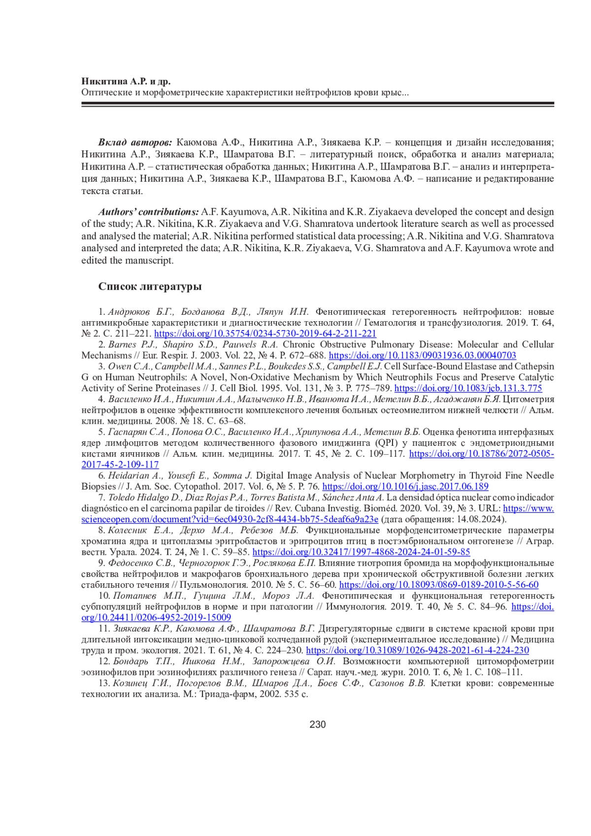 12. Бондарь Т.П., Ишкова Н.М., Запорожцева О.И. Возможности компьютерной цитоморфометрии эозинофилов при эозинофилиях различного генеза // Сарат. науч.-мед. журн. 2010. Т. 6, No 1. С. 108-111. EDN: MQFYFH