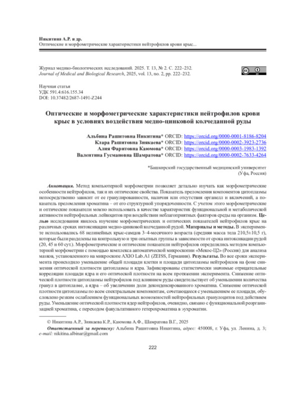 Целью исследования явилось изучение морфометрических и оптических показателей нейтрофилов крыс на различных сроках интоксикации медно-цинковой колчеданной рудой.