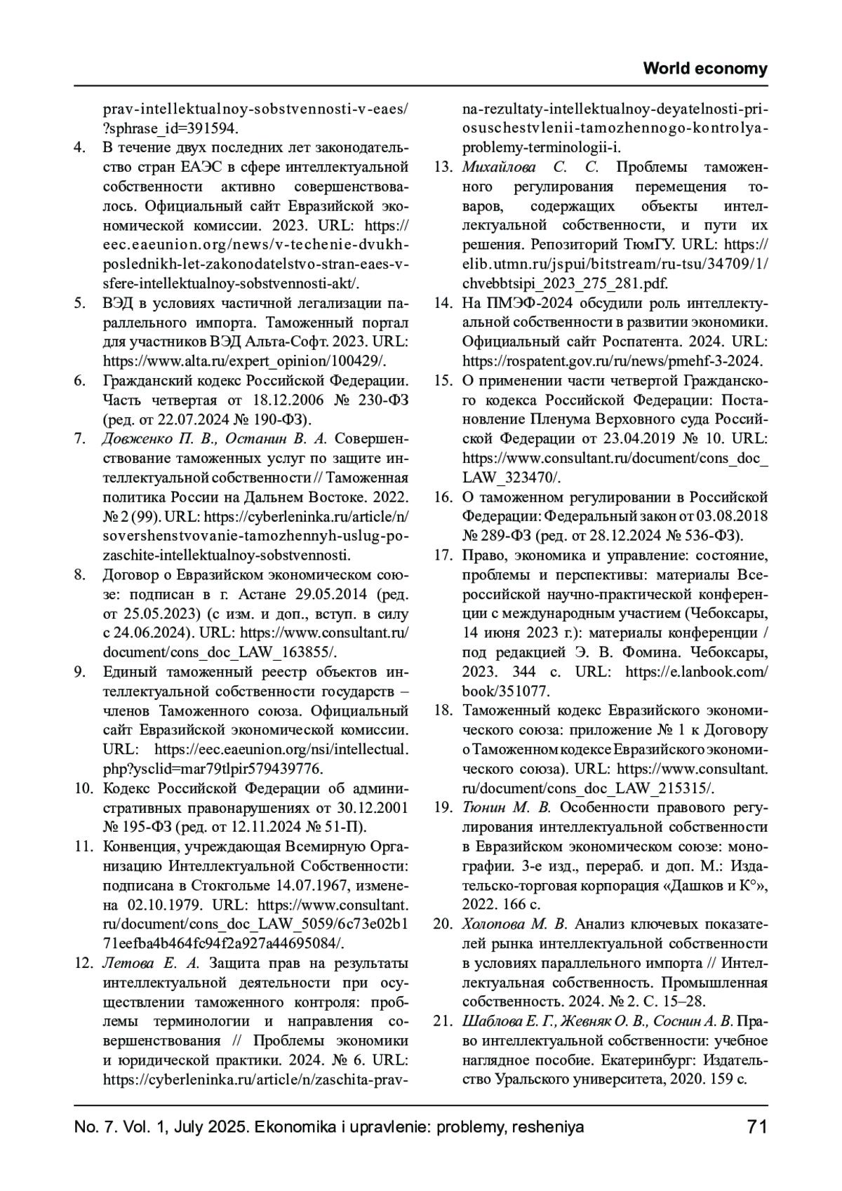 7. Довженко П. В., Останин В. А. Совершенствование таможенных услуг по защите интеллектуальной собственности // Таможенная политика России на Дальнем Востоке. 2022. № 2 (99). URL: https://cyberleninka.ru/article/n/sovershenstvovanie-tamozhennyh-uslug-pozaschite-intellektualnoy-sobstvennosti. EDN: TDCIDL