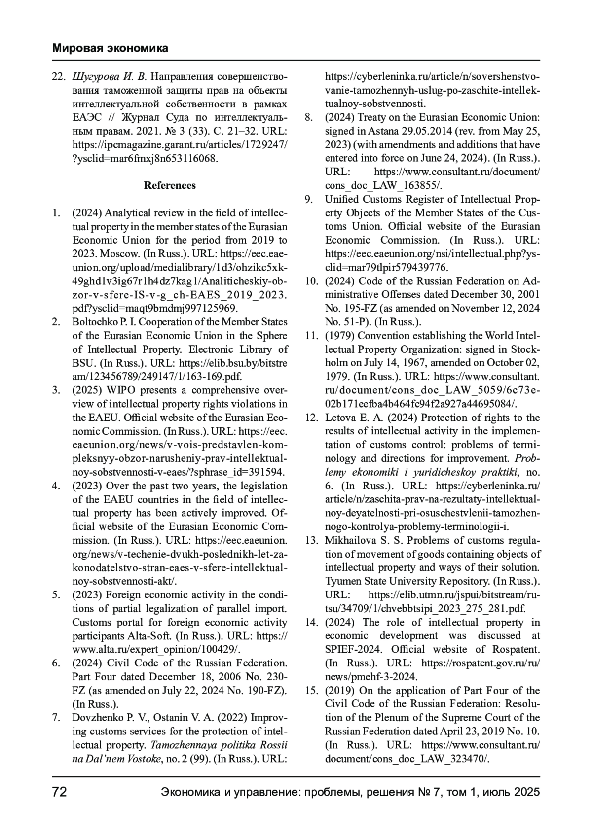 3. В ВОИС представлен комплексный обзор нарушений прав интеллектуальной собственности в ЕАЭС. Официальный сайт Евразийской экономической комиссии. 2025. URL: https://eec.eaeunion.org/news/v-voispredstavlen-kompleksnyy-obzor-narusheniyprav-intellektualnoy-sobstvennosti-v-eaes/?sphrase_id=391594.