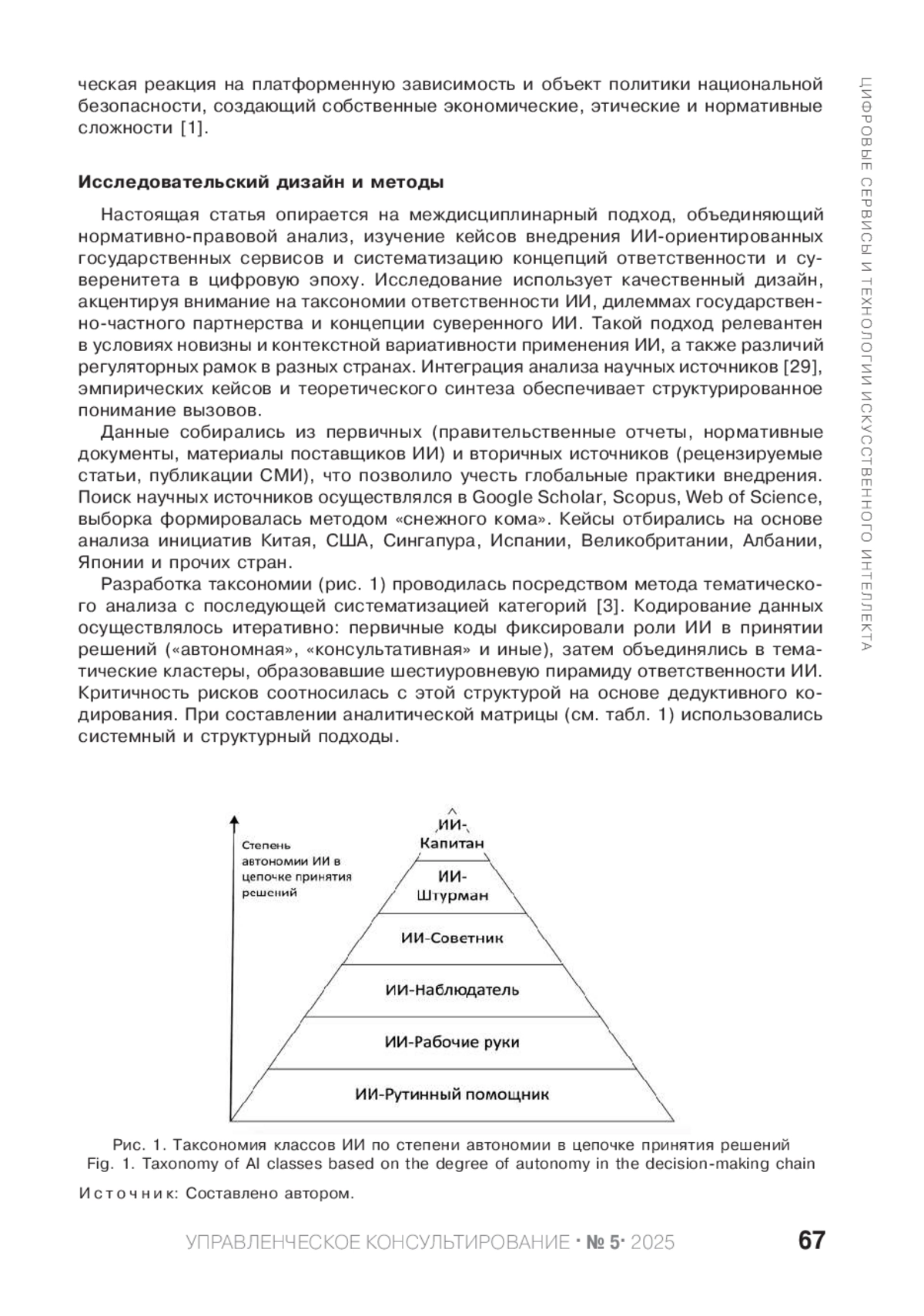 Настоящее исследование анализирует институциональные и технологические вызовы интеграции систем искусственного интеллекта (ИИ) в публичное администрирование и государственные сервисы, фокусируясь на классификации ролей алгоритмов в процессах принятия решений, балансе интересов в сотрудничестве с коммерческими поставщиками ИИ-решений и инфраструктуры, а также обеспечении национальной технологической автономии. Применен качественный междисциплинарный подход, сочетающий нормативноправовой анализ, тематический анализ эмпирических кейсов из практики различных стран и теоретический синтез. Данные собраны из официальных источников, рецензируемых научных публикаций и новостных источников с использованием метода снежного кома для отбора кейсов, а кодирование проводилось итеративно. В результате разработана оригинальная авторская шестиуровневая пирамидальная модель распределения ответственности в зависимости от степени автономии алгоритмов ИИ в цепочке принятия решений: от полной делегации («ИИ-Капитан») через предложение готового решения с утверждением человеком («ИИ-Штурман»), набор конфигураций («ИИ-Советник»), анализ среды с сигнализацией триггеров («ИИ-Наблюдатель» ), выполнение трудозатратных задач с ревизией оператором («ИИ-Рабочие руки») до рутинной поддержки без решений («ИИ-Рутинный помощник»). Модель наложена на градации рисков (высокий, ограниченный, минимальный) для оценки последствий ошибок. Выявлена дилемма государственно-частного партнерства, обеспечивающего доступ к инновациям, но усиливающего зависимость и уязвимости. Также обоснована роль суверенного ИИ как стратегии снижения этих рисков. Для эффективной интеграции алгоритмов в государственные сервисы рекомендуется внедрение обязательной классификации систем ИИ по уровням автономии и критичности, где шестиуровневая таксономия обеспечивает дифференцированный подход к распределению ответственности, минимизируя институциональные пробелы и риски предвзятости.