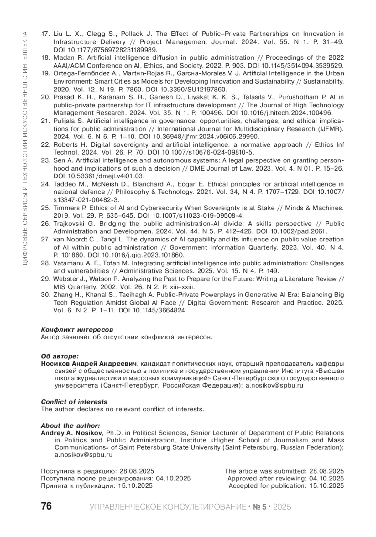 28. Vatamanu A. F., Tofan M. Integrating artificial intelligence into public administration: Challenges and vulnerabilities // Administrative Sciences. 2025. Vol. 15. N 4. P. 149.