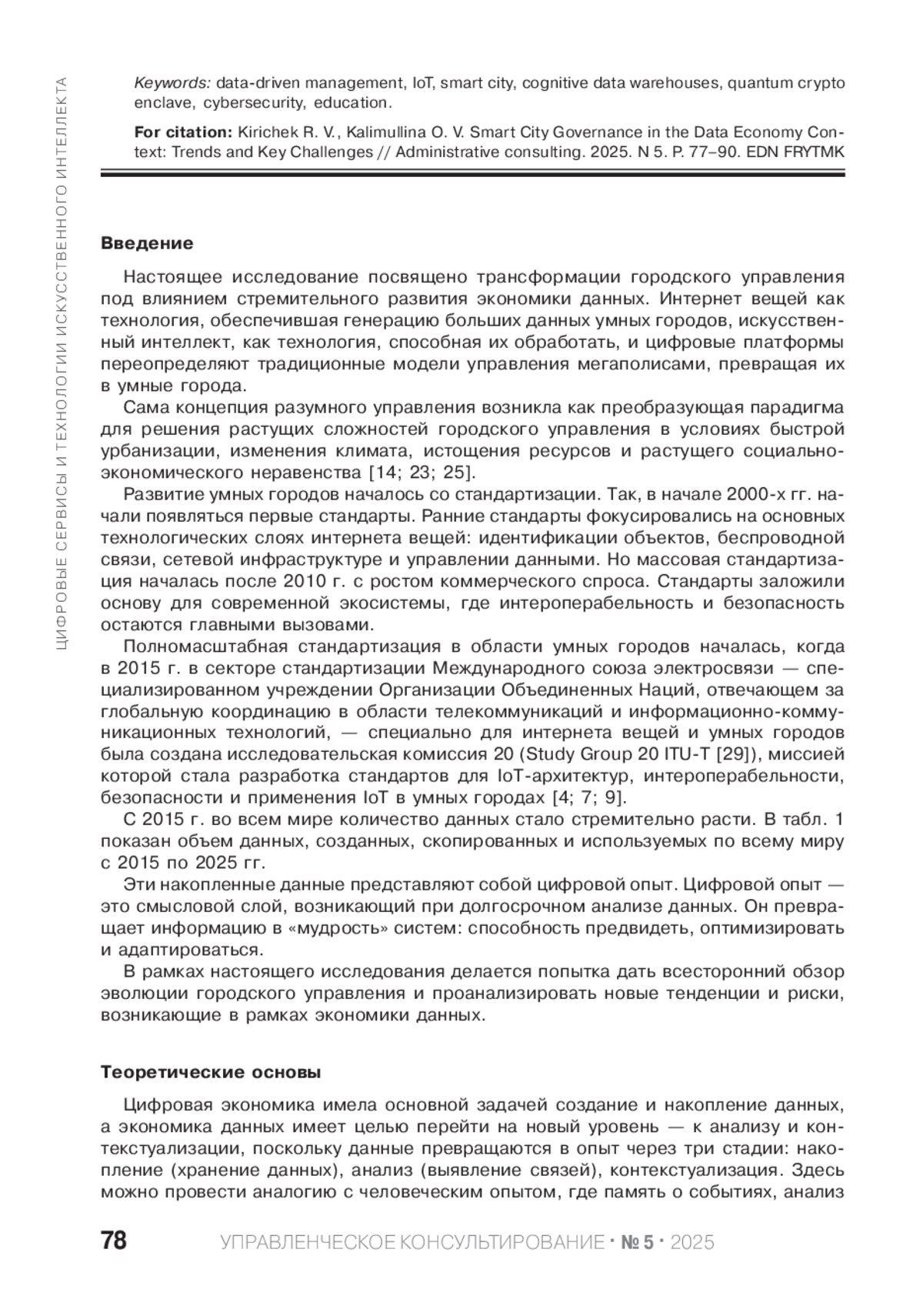В исследовании использованы такие методы, как сравнительный анализ, обобщение, методы наукометрического анализа и качественного контент-анализа научных публикаций. Базируясь на проведенном исследовании, авторы выделяют основные тенденции управления умным городом на основе данных и вызовы в сфере управления умным городом, предлагают меры, направленные на решение существующих проблем и снижение угроз.