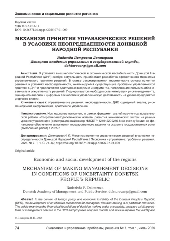 В условиях внешнеполитической и экономической нестабильности Донецкой Народной Республики (ДНР) особую актуальность приобретает разработка эффективного механизма управленческого принятия решений. В статье рассматриваются теоретические основы принятия решений в условиях неопределенности, анализируются существующие проблемы управленческой практики в ДНР и предлагаются адаптивные модели и инструменты, позволяющие повысить обоснованность и оперативность решений. Подчеркивается необходимость интеграции риск-менеджмента, сценарного анализа и цифровых технологий в управленческую деятельность на уровне предприятий и органов власти.