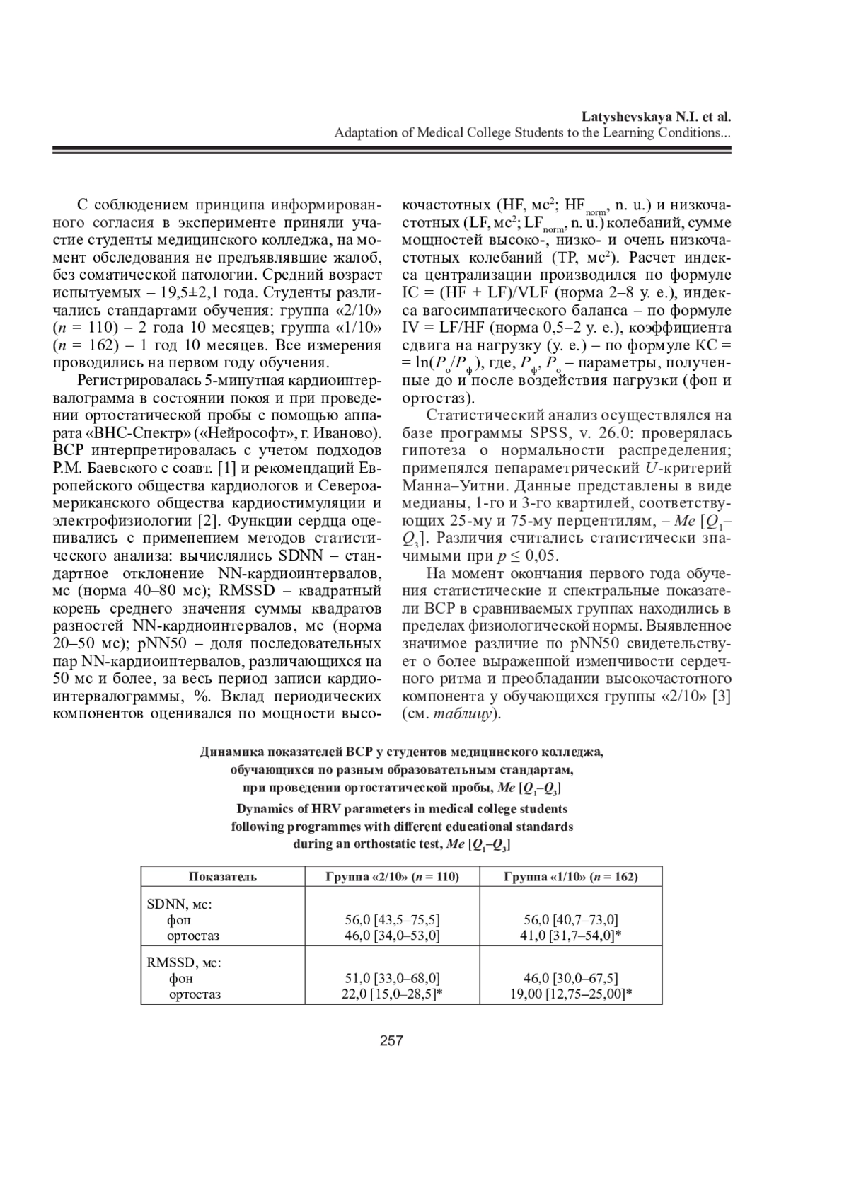 Проведен сравнительный анализ вариабельности сердечного ритма студентов медицинского колледжа, обучающихся по новому образовательному стандарту (1 год 10 месяцев; n = 110) и обучающихся 2 года 10 месяцев (n = 162). С использованием прибора «ВНС-Спектр» («Нейрософт», Россия) регистрировались параметры вариабельности сердечного ритма. В результате проведенного исследования установлено перенапряжение регуляторных механизмов сердечной деятельности у студентов, обучающихся 1 год 10 месяцев, вследствие интенсификации учебного процесса. Это обосновывает использование вариабельности сердечного ритма как показателя адаптации студентов к условиям обучения при разных образовательных стандартах и необходимость разработки комплекса профилактических мероприятий.