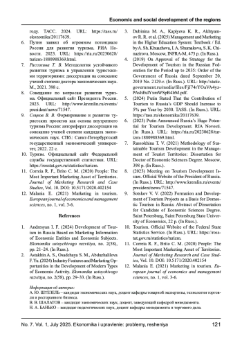 1. Андресян И. Ф. Развитие туризма в России на основе маркетинговой информации хозяйствующих субъектов и субъектов экономики // Экономика устойчивого развития. 2024. № 2(58). С. 21-24. EDN: IUNJQV