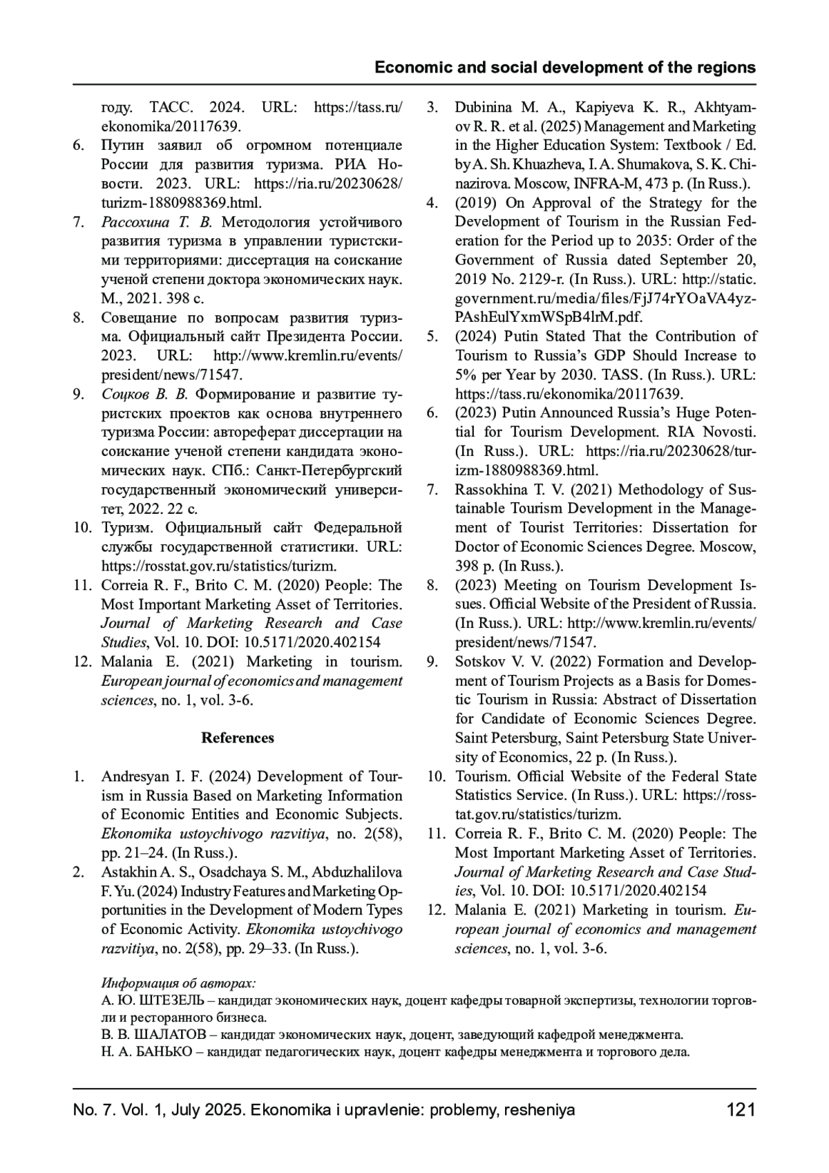 7. Рассохина Т. В. Методология устойчивого развития туризма в управлении туристскими территориями: диссертация на соискание ученой степени доктора экономических наук. М., 2021. 398 с. EDN: EFZCDL