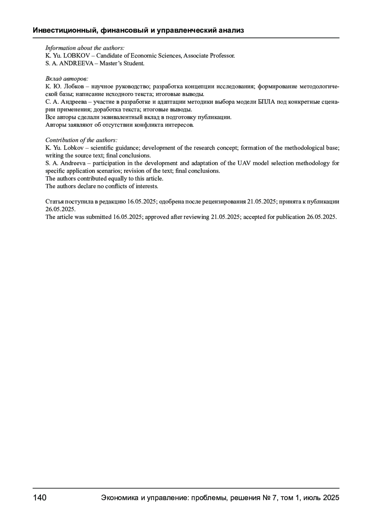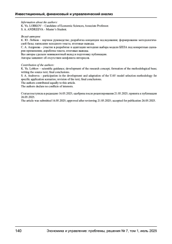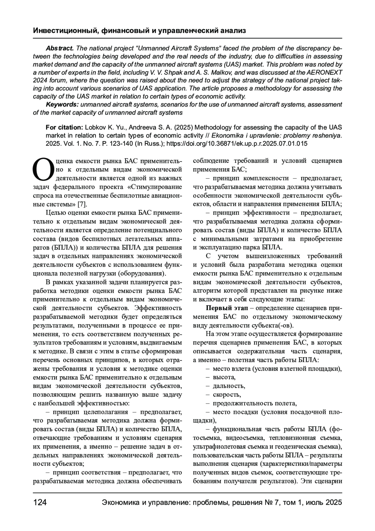 Национальный проект «Беспилотные авиационные системы» столкнулся с проблемой несоответствия разрабатываемых технологий реальным потребностям промышленности, связанную с трудностями в оценке рыночного спроса и емкости рынка беспилотных авиационных систем (БАС). Эта проблема была отмечена рядом экспертов в указанной области, включая В. В. Шпака и А. С. Малькова, а также обсуждалась на форуме «АЭРОНЕКСТ 2024», где поднимался вопрос о необходимости корректировки стратегии национального проекта с учетом различных сценариев применения БАС. В рамках статьи предложена методика оценки емкости рынка БАС применительно к отдельным видам экономической деятельности.