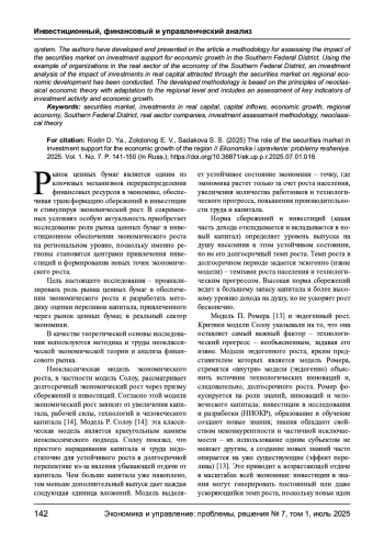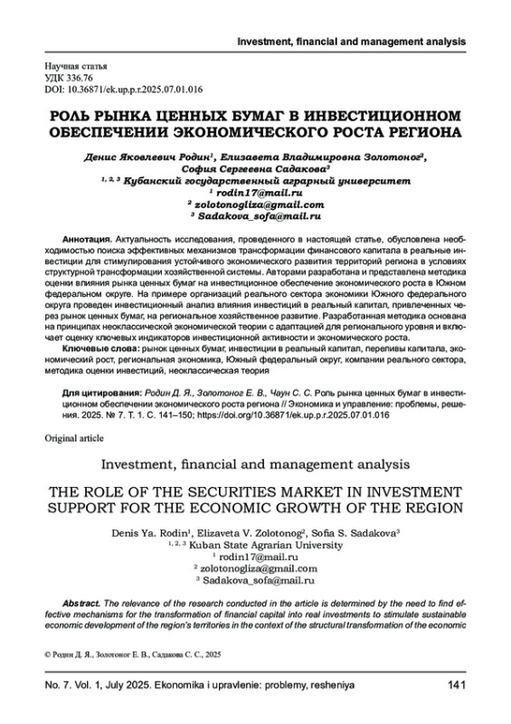 Актуальность исследования, проведенного в настоящей статье, обусловлена необходимостью поиска эффективных механизмов трансформации финансового капитала в реальные инвестиции для стимулирования устойчивого экономического развития территорий региона в условиях структурной трансформации хозяйственной системы. Авторами разработана и представлена методика оценки влияния рынка ценных бумаг на инвестиционное обеспечение экономического роста в Южном федеральном округе. На примере организаций реального сектора экономики Южного федерального округа проведен инвестиционный анализ влияния инвестиций в реальный капитал, привлеченных через рынок ценных бумаг, на региональное хозяйственное развитие. Разработанная методика основана на принципах неоклассической экономической теории с адаптацией для регионального уровня и включает оценку ключевых индикаторов инвестиционной активности и экономического роста.