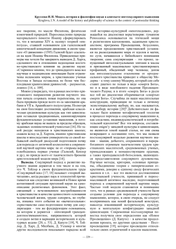 Выводы. Необходимо переосмыслить значение средневековой науки и метафизической теологии и рассматривать их как преемников, не только воспринявших античное наследие, но и подготовивших все условия для перехода к секулярному мышлению и современной научной картине мира.