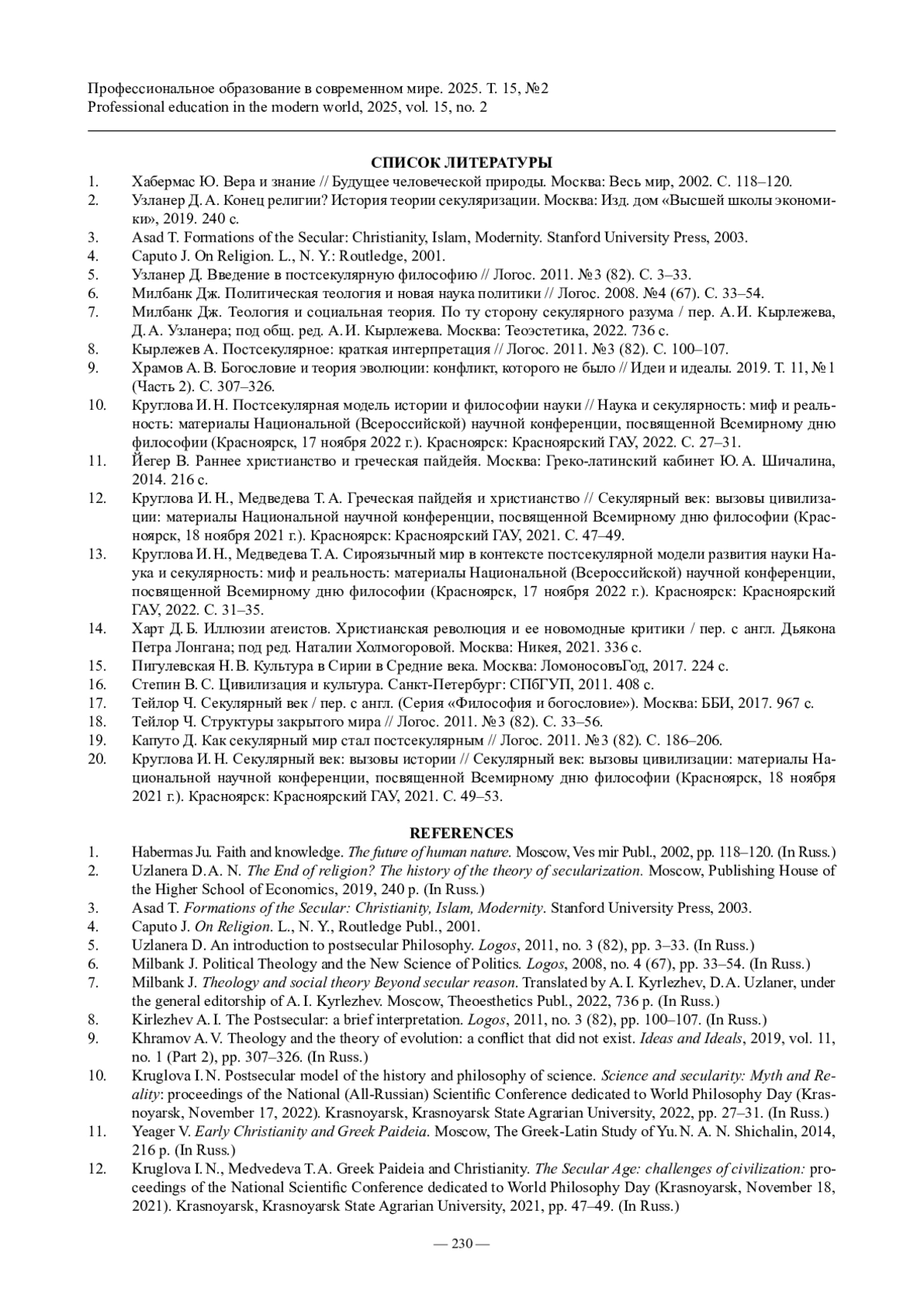 8. Кырлежев А. Постсекулярное: краткая интерпретация // Логос. 2011. № 3 (82). С. 100-107.