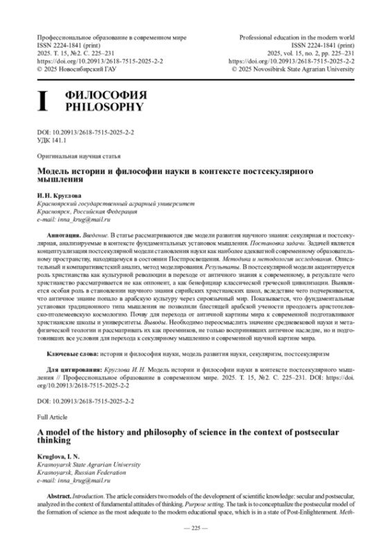 10. Круглова И.Н. Постсекулярная модель истории и философии науки // Наука и секулярность: миф и реальность: материалы Национальной (Всероссийской) научной конференции, посвященной Всемирному дню философии (Красноярск, 17 ноября 2022 г.). Красноярск: Красноярский ГАУ, 2022. С. 27-31.