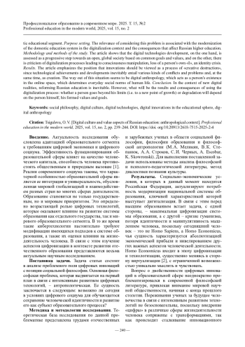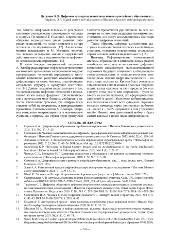 Выводы. В контексте новых цифровых реалий реформирование российского образования неизбежно. Однако какими будут результаты и последствия использования процесса цифровизации: выход человека за свои пределы (то есть в новую точку роста) или деградации будет зависеть от самого человека, его сформированных ценностей и целей.