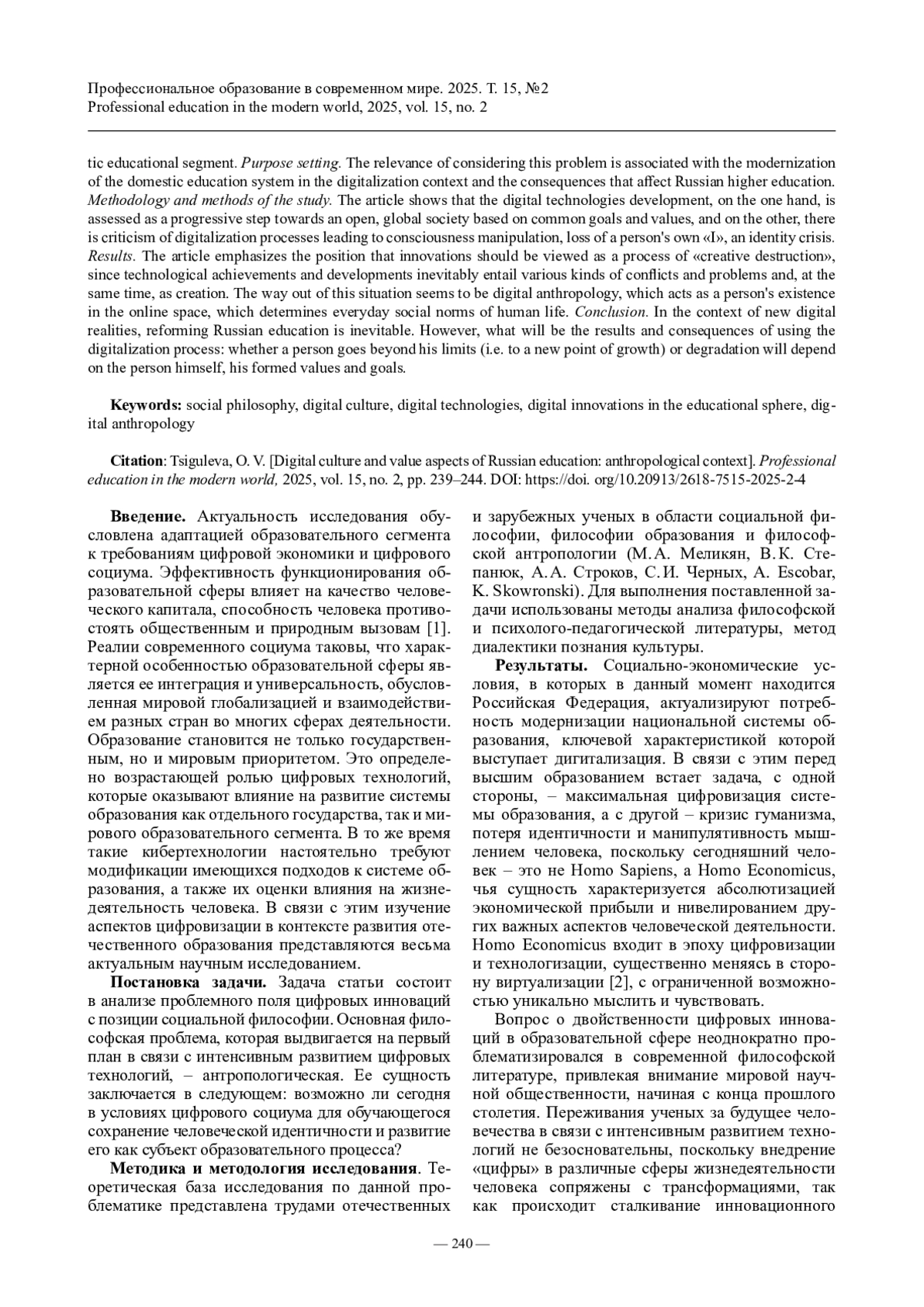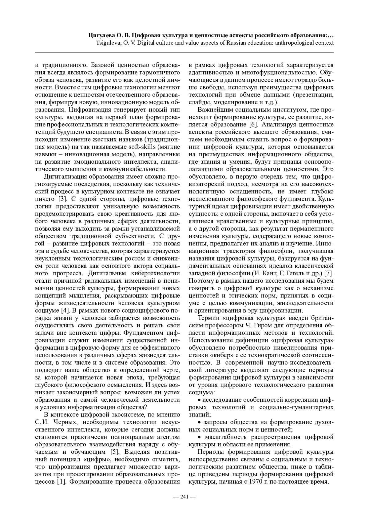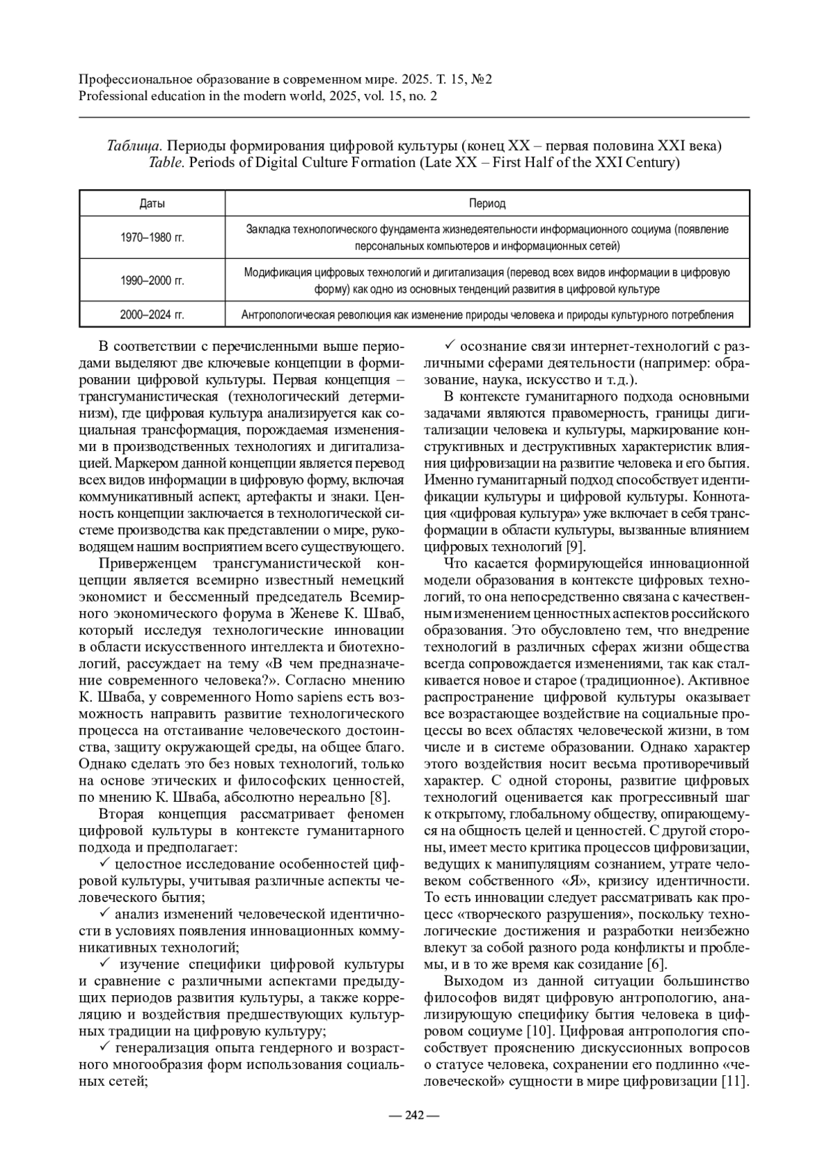 Введение. В статье исследуется понятие «цифровая культура», рассмотрены периоды ее формирования, связанные с социальным и технологическим развитием общества. Отмечается, что формирующаяся инновационная модель образования в контексте цифровых технологий оказывает влияние на качественные изменения ценностных аспектов отечественного образовательного сегмента.