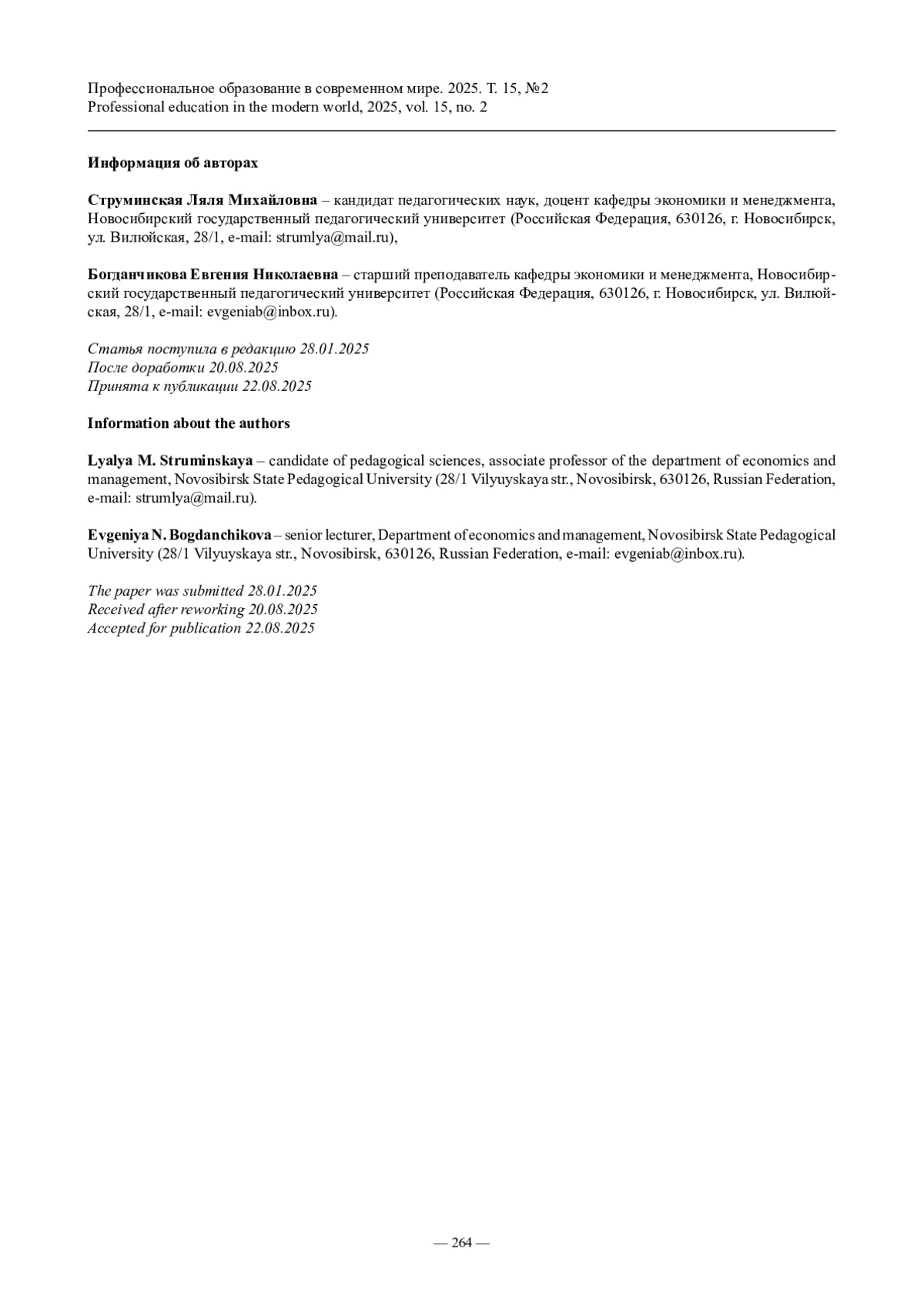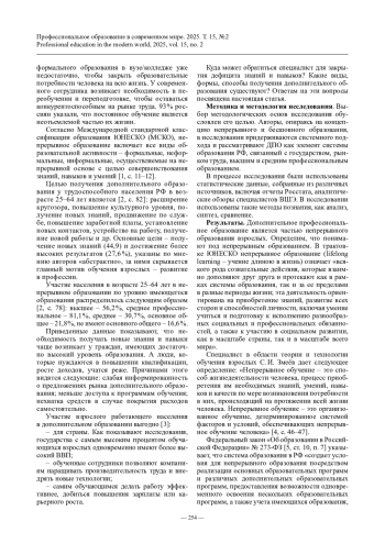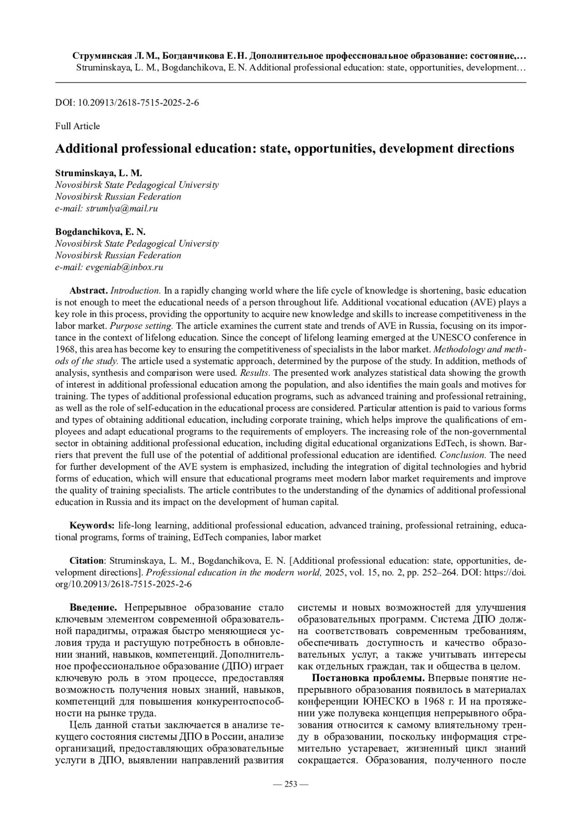 Выводы. Подчеркивается необходимость дальнейшего развития системы ДПО, включая интеграцию цифровых технологий и гибридных форм обучения, что позволит обеспечить соответствие образовательных программ современным требованиям рынка труда и повысить качество подготовки специалистов. Статья вносит вклад в понимание динамики дополнительного профессионального образования в России и его влияния на развитие человеческого капитала.