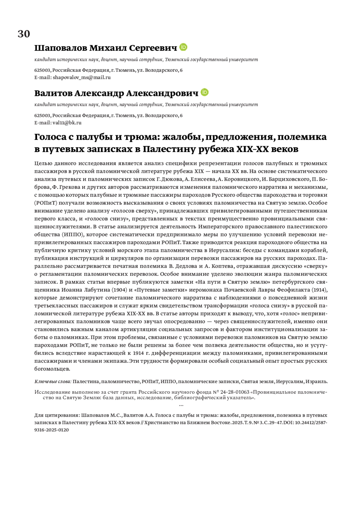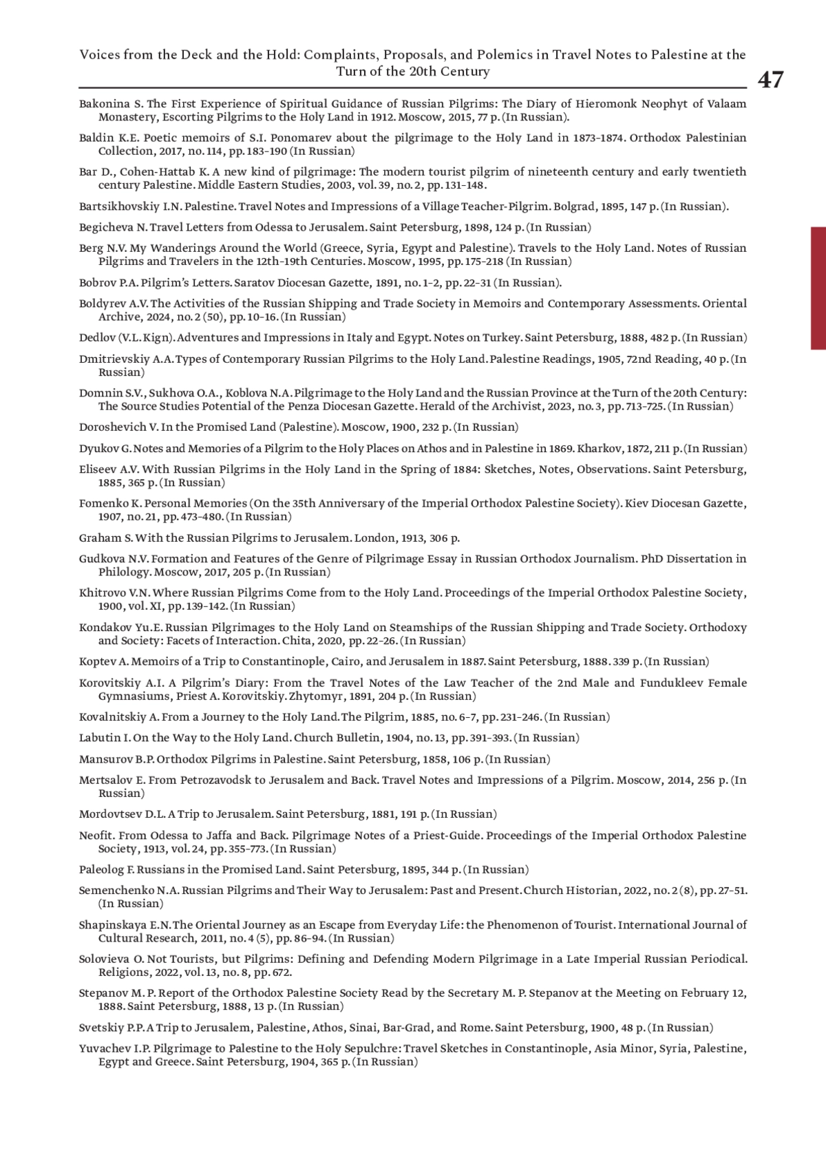 The aim of this study is to analyze the specific ways in which the voices of deck and hold passengers were represented in Russian pilgrimage literature at the turn of the 19th–20th centuries. Based on a systematic analysis of travel and pilgrimage accounts by G. Dyukov, A. Eliseev, A. Korovitsky, I. Bartsikhovsky, P. Bobrov, F. Grekov, and other authors, the article examines changes in the pilgrimage narrative and the mechanisms by which deck and hold passengers of the Russian Steamship and Trading Company (ROPiT) were able to express their views on the conditions of their journey to the Holy Land. Special attention is given to the analysis of the «voices from above», belonging to privileged first-class travelers, and the «voices from below», represented in texts primarily by provincial clergymen. The article also explores the activities of the Imperial Orthodox Palestine Society (IOPS), which systematically sought to improve the conditions of transportation for non-privileged passengers aboard ROPiT steamships. The response of the steamship company to public criticism of conditions on the maritime leg of the pilgrimage to Jerusalem is discussed, including conversations with ship crews and the publication of instructions and circulars on the organization of passenger transport on Russian steamships. In parallel, the printed polemics of V. Dedlov and A. Koptev are considered, reflecting an «upper-level» debate on the regulation of pilgrimage transportation. Particular attention is devoted to the evolution of the pilgrimage account as a genre. Within the framework of the article, for the first time, notes such as «On the Way to the Holy Land» by the St. Petersburg priest Ioann Labutin (1904) and «Travel Notes» by the hieromonk Theophilact of Pochaev Lavra (1914) are published. These texts combine pilgrimage narrative with observations of the everyday life of third-class passengers and serve as vivid evidence of the transformation of the «voice from below» in Russian pilgrimage literature at the turn of the 19th–20th centuries. The authors conclude that, although the «voice» of non-privileged pilgrims was most often expressed indirectly — through clergymen — it was precisely the latter who became an important channel for articulating social demands and a factor in the institutionalization of care for pilgrims. At the same time, the problems associated with the transportation of pilgrims to the Holy Land by ROPiT steamships were not only unresolved over more than half a century of the company’s activity, but also worsened due to the growing differentiation by 1914 between pilgrims, privileged passengers, and crew members. These difficulties shaped the distinctive social experience of ordinary Russian pilgrims.