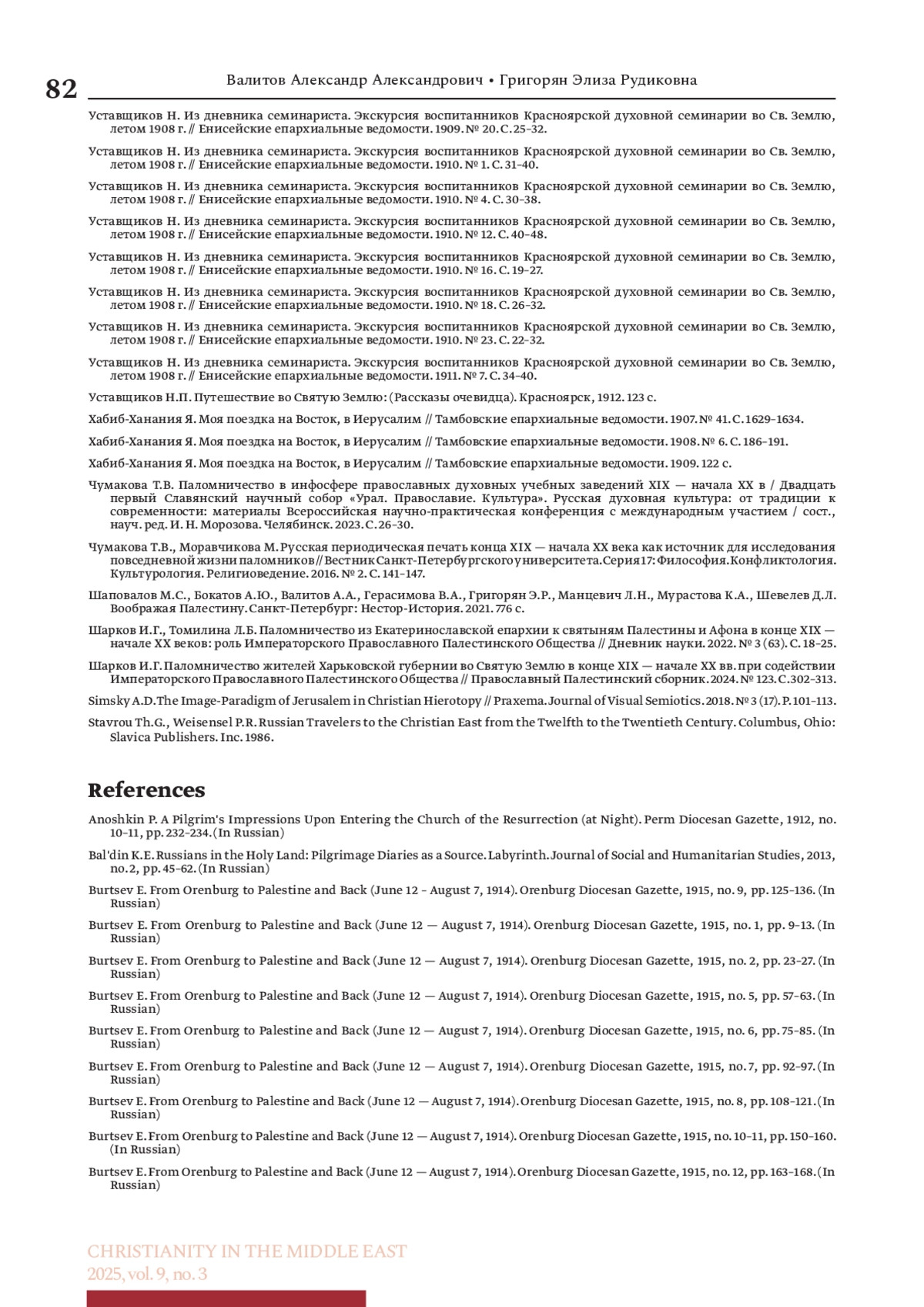 2. Балдин К. Е. Русские в Святой Земле: паломнические дневники как источник // Лабиринт. Журнал социально-гуманитарных исследований. 2013. № 2. С. 45-62.