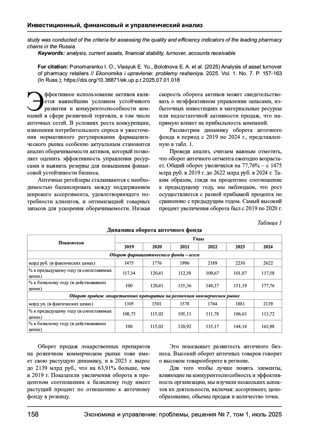 Эффективное управление оборотными активами играет ключевую роль в обеспечении финансовой устойчивости и конкурентоспособности аптечных ретейлеров. В статье рассматриваются особенности анализа оборачиваемости активов аптечных ретейлеров как одного из ключевых показателей эффективности их финансово-хозяйственной деятельности. Проведено исследование критериев оценки показателей качества и эффективности ведущих аптечных сетей России.