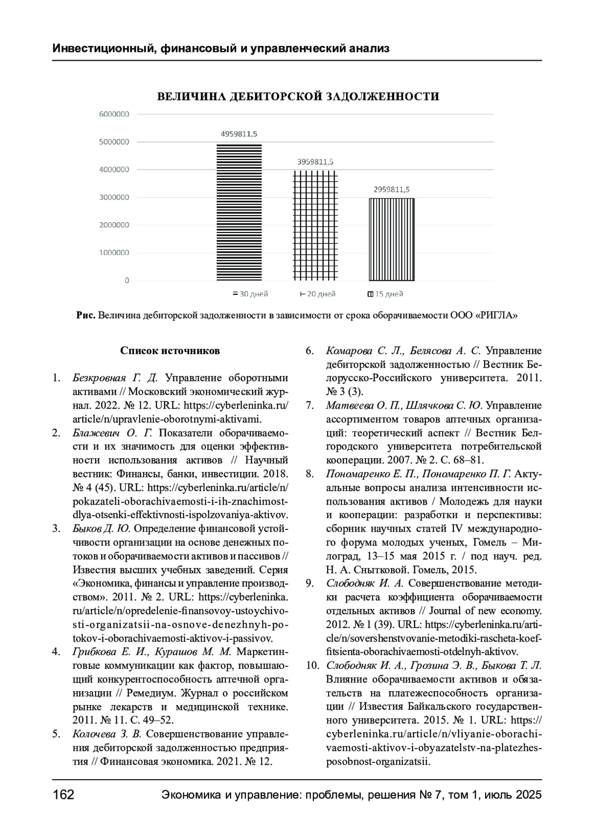 10. Слободняк И. А., Грозина Э. В., Быкова Т. Л. Влияние оборачиваемости активов и обязательств на платежеспособность организации // Известия Байкальского государственного университета. 2015. № 1. URL: https://cyberleninka.ru/article/n/vliyanie-oborachivaemosti-aktivov-i-obyazatelstv-na-platezhesposobnost-organizatsii. EDN: TIWVBD