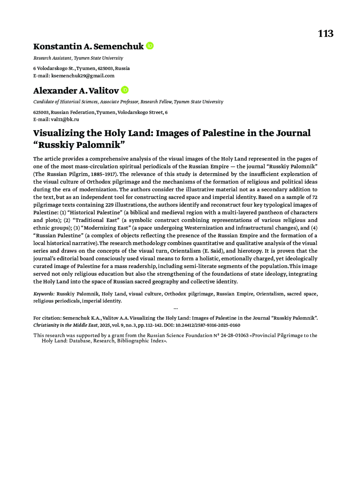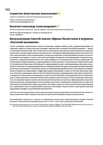 Статья посвящена комплексному анализу визуальных образов Святой земли, репрезентированных на страницах одного из самых массовых духовных периодических изданий Российской империи — журнала «Русский паломник» (1885–1917). Актуальность исследования обусловлена недостаточной изученностью визуальной культуры православного паломничества и механизмов формирования религиозно-политических представлений в эпоху модернизации. Авторы рассматривают иллюстративный материал не как второстепенное дополнение к тексту, а как самостоятельный инструмент конструирования сакрального пространства и имперской идентичности. На основе выборки из 72 паломнических текстов, содержащих 229 иллюстраций, авторы выявляют и реконструируют четыре ключевых типологических образа Палестины: (1) «Историческая Палестина» (библейский и средневековый регион с многоуровневым пантеоном персонажей и сюжетов); (2) «Традиционный Восток» (символический конструкт, объединяющий репрезентации различных религиозных и этнических групп); (3) «Модернизирующийся Восток» (пространство, подвергающееся влиянию вестернизации и инфраструктурных изменений), а также (4) «Русская Палестина» (комплекс объектов, отражающих присутствие Российской империи и формирование локального исторического нарратива). Методология исследования сочетает количественный и качественный анализ визуального ряда, а также привлекает концепции визуального поворота, ориентализма (Э. Саид) и иеротопии. Доказывается, что редакция журнала сознательно использовала визуальные средства для формирования у массового читателя, включая малограмотные слои населения, целостного, эмоционально насыщенного, но при этом идеологически выверенного образа Палестины. Этот образ служил не только религиозному просвещению, но и укреплению основ государственной идеологии, интегрируя Святую землю в пространство русской сакральной географии и коллективной идентичности.