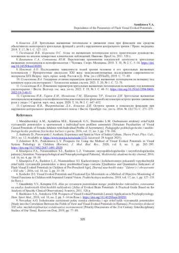 12. Сироткина И.В., Гареев Е.М., Михайлова Г.М., Шакирова Э.Р., Кошелев Д.И. Зрительные вызванные потенциалы на вспышку и психофизиологические показатели зрительной системы при остроте зрения “движение руки у лица” // Саратов. науч.-мед. журн. 2020. Т. 16, No 2. С. 647-652. EDN: KPJCHW