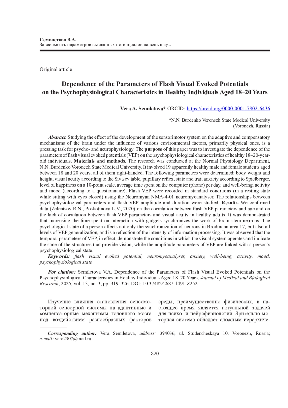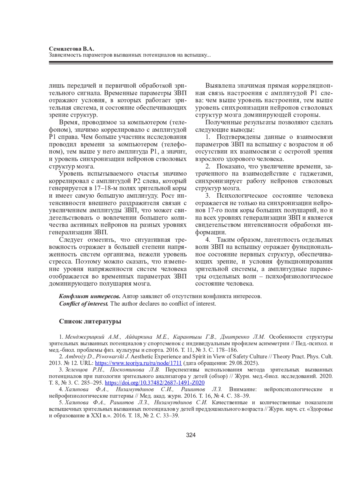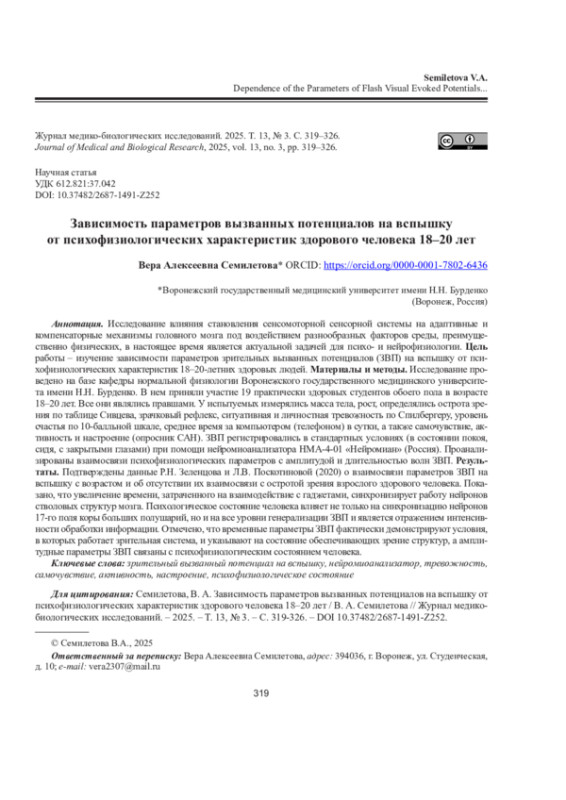 Материалы и методы. Исследование проведено на базе кафедры нормальной физиологии Воронежского государственного медицинского университета имени Н. Н. Бурденко. В нем приняли участие 19 практически здоровых студентов обоего пола в возрасте 18-20 лет. Все они являлись правшами. У испытуемых измерялись масса тела, рост, определялись острота зрения по таблице Сивцева, зрачковый рефлекс, ситуативная и личностная тревожность по Спилбергеру, уровень счастья по 10-балльной шкале, среднее время за компьютером (телефоном) в сутки, а также самочувствие, активность и настроение (опросник САН). ЗВП регистрировались в стандартных условиях (в состоянии покоя, сидя, с закрытыми глазами) при помощи нейромиоанализатора НМА-4-01 «Нейромиан» (Россия). Проанализированы взаимосвязи психофизиологических параметров с амплитудой и длительностью волн ЗВП. Результаты. Подтверждены данные Р. Н. Зеленцова и Л. В. Поскотиновой (2020) о взаимосвязи параметров ЗВП на вспышку с возрастом и об отсутствии их взаимосвязи с остротой зрения взрослого здорового человека. Показано, что увеличение времени, затраченного на взаимодействие с гаджетами, синхронизирует работу нейронов стволовых структур мозга. Психологическое состояние человека влияет не только на синхронизацию нейронов 17-го поля коры больших полушарий, но и на все уровни генерализации ЗВП и является отражением интенсивности обработки информации. Отмечено, что временные параметры ЗВП фактически демонстрируют условия, в которых работает зрительная система, и указывают на состояние обеспечивающих зрение структур, а амплитудные параметры ЗВП связаны с психофизиологическим состоянием человека.