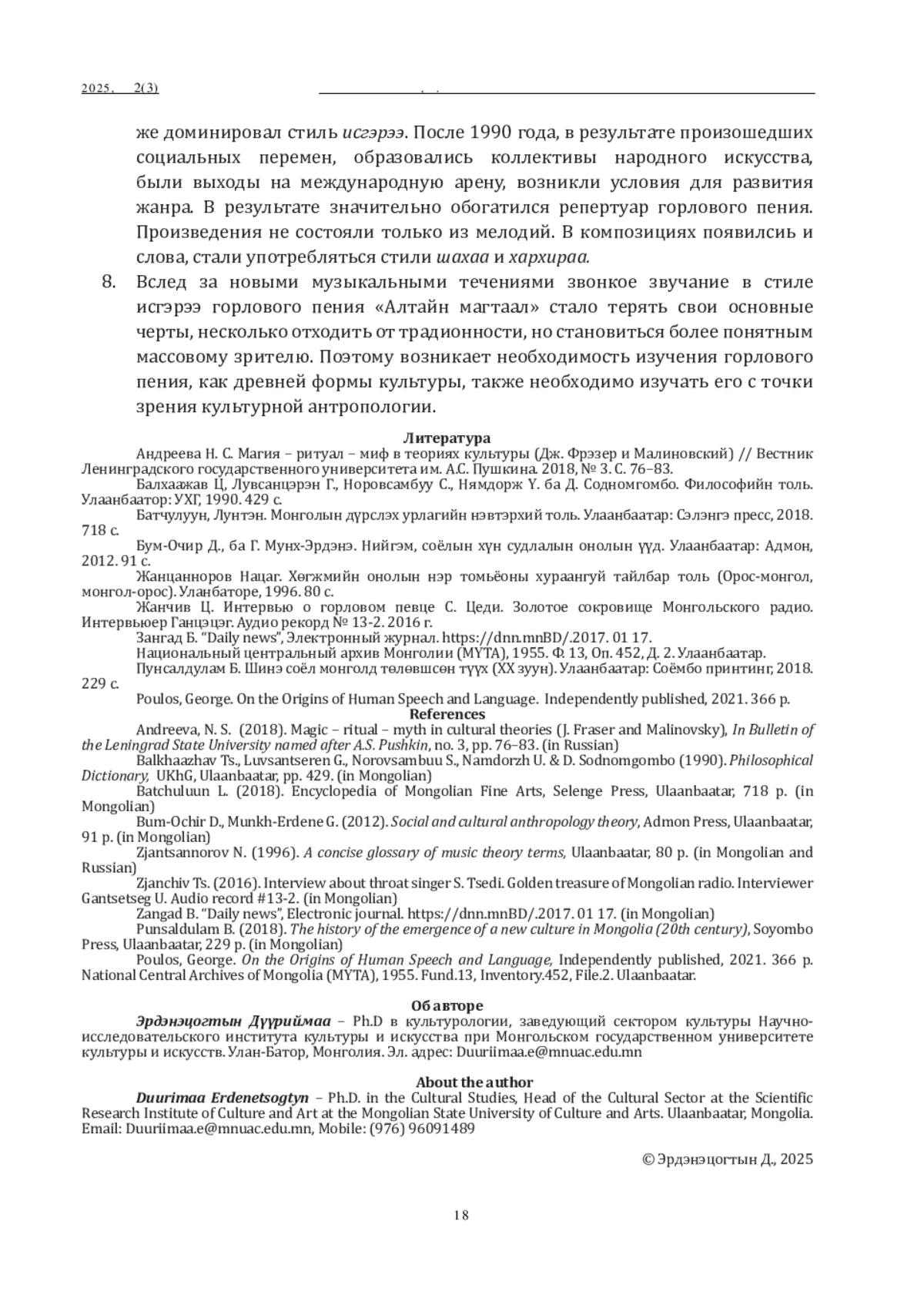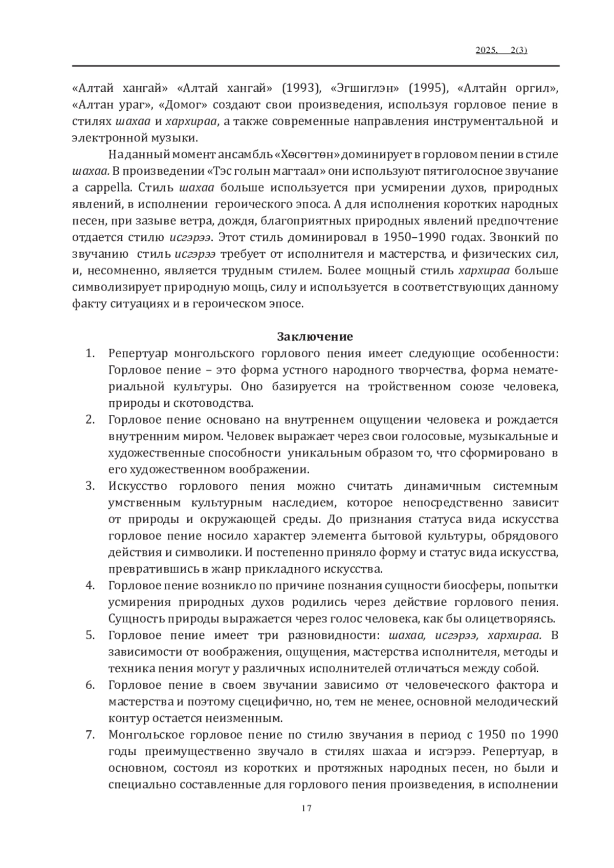 Горловое пение – это уникальный вид искусства монголов, который детерминирован природными, социальными и бытовыми факторами. Горловое пение издавна применялось в обрядах, ритуалах, служило средством общения не только в сфере скотоводства, но и с окружаящим миром и природой. Мы поставили своей целью определить особенности репертуара горлового пения в зависимости от определенного исторического периода, в том числе особенности репертуара исполнителей, тематику, технику исполнения, манеру исполнения, а также значимость, функции и тенденции развития данного вида искусства. Монголы в жанре горлового пения создали уникальные звучания, мелодии, в этом плане горловое пение является особым культурным символом, метафорой, выражением мировоззрения.