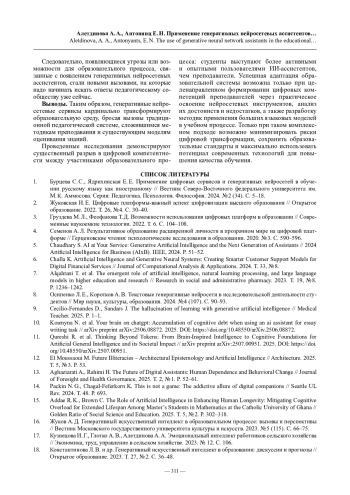 1. Бурцева С.С., Ядрихинская Е.Е. Применение цифровых сервисов и генеративных нейросетей в обучении русскому языку как иностранному // Вестник Северо-Восточного федерального университета им. М.К. Аммосова. Серия: Педагогика. Психология. Философия. 2024. № 2 (34). С. 5-18.