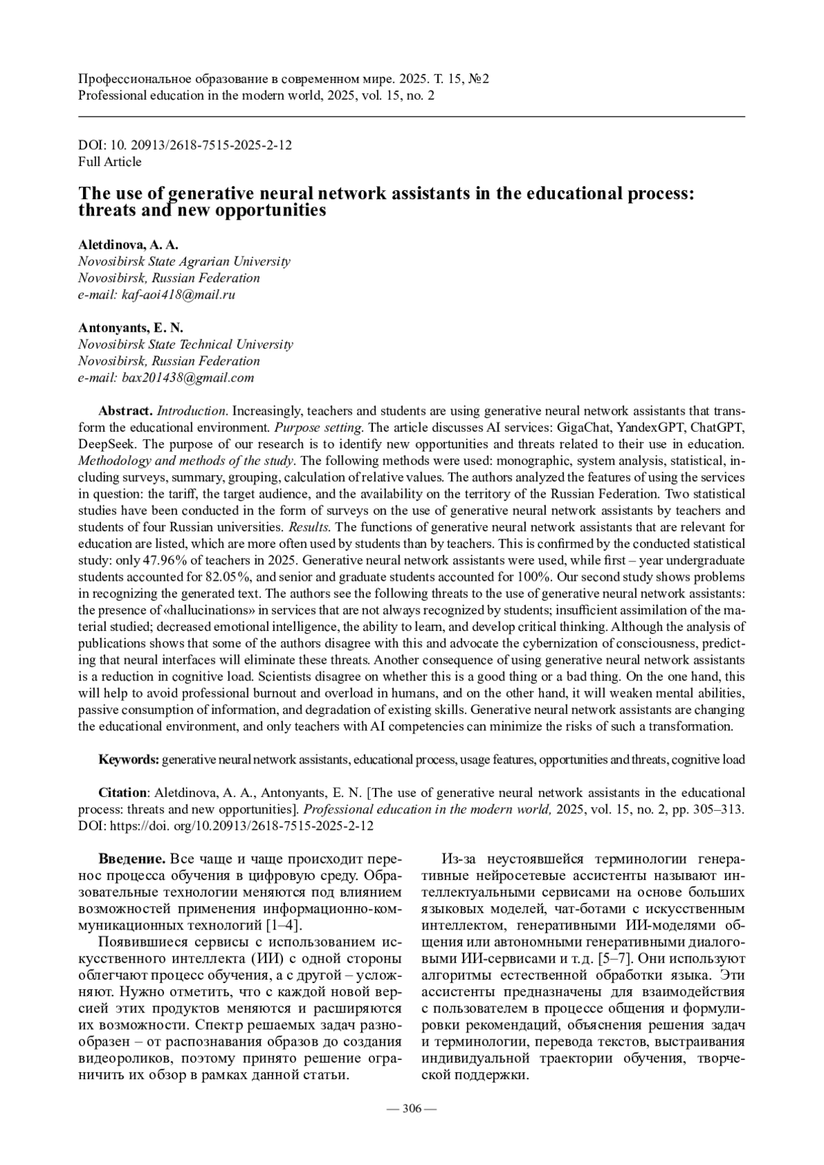 Результаты. Перечислены актуальные для образования функции генеративных нейросетевых ассистентов, которые чаще используют студенты, чем преподаватели. Это подтверждает проведенное статистическое исследование: только 47,96 % преподавателей в 2025 г. применяли генеративные нейросетевые ассистенты, при этом студенты первых курсов бакалавриата – 82,05 %, а более старших курсов и магистратуры – 100 %. Второе наше исследование показывает проблемы в распознавании сгенерированного текста. В качестве угроз использования генеративных нейросетевых ассистентов авторы видят: наличие у сервисов «галлюцинаций», которые не всегда распознаются студентами; недостаточное усвоение пройденного материала; снижение эмоционального интеллекта, способности обучаться, развивать критическое мышление. Хотя анализ публикаций показывает, что часть авторов с этим не согласна и пропагандирует кибернизацию сознания, прогнозируя, что нейроинтерфейсы устранят эти угрозы. Еще одним из последствий применения генеративных нейросетевых ассистентов становится снижение когнитивной нагрузки. Ученые расходятся во мнении, плохо это или хорошо. С одной стороны это позволит избежать профессионального выгорания, перегрузки у человека, а с другой – ослаблению умственных способностей, пассивному потреблению информации, деградации уже имеющихся навыков. Генеративные нейросетевые ассистенты меняют образовательную среду, и минимизировать риски такой трансформации смогут только преподаватели, обладающие ИИ-компетенциями.