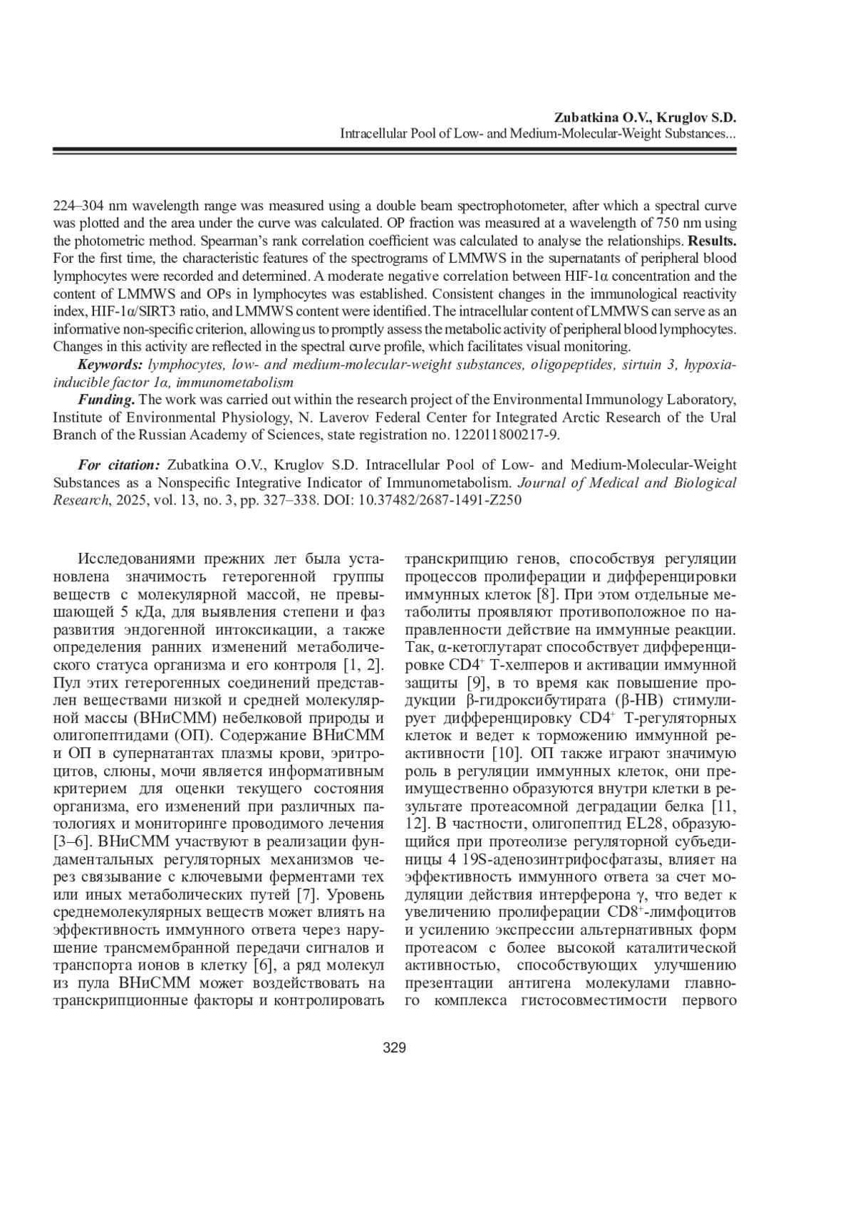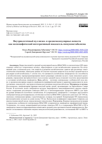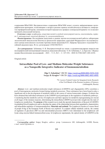 Вещества низкой и средней молекулярной массы (ВНиСММ) и олигопептиды (ОП) представляют собой пул гетерогенных молекул, образующихся в ходе метаболических процессов. На сегодняшний день установлена роль этих веществ в развитии метаболических сдвигов при различных гомеостатических изменениях, накоплены данные об участии отдельных веществ пула молекул средней массы в регуляции путей метаболизма. С учетом того, что активность метаболизма лимфоцитов и их способность к метаболическому перепрограммированию имеют решающее значение на всех этапах иммунного реагирования, определение внутриклеточного пула молекул средней массы позволяет получить представление о состоянии метаболизма лимфоцитов.