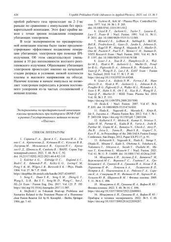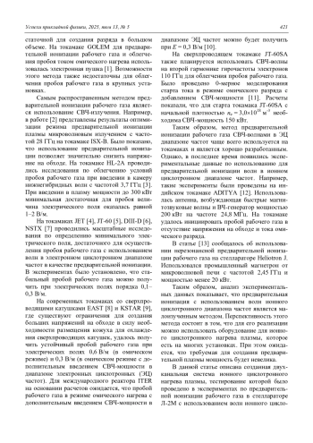 Проведены эксперименты по предварительной ионизации плазмы стелларатора Л-2М с использованием двухканальной системы ионного циклотронного резонансно-го нагрева. Мощность каждого канала нагрева составляла 1 кВт. ВЧ-мощность для предварительной ионизации рабочего газа подавалась на антенну за 10 мс до возникновения напряжения на обходе. Проведение предварительной ионизации позволило уменьшить напряжение на обходе перед пробоем рабочего газа на 15–20 %. Задержка между моментом возникновения напряжения на обходе и моментом пробоя рабочего газа уменьшилась вдвое. Вследствие этого наблюдалось подавление генерации убегающих электронов на начальной стадии разряда, возникающей в условиях низкой плотности плазмы и высокого напряжения на обходе. При подаче ВЧ-напряжения на антенну детектором ДРГ3-01 было зарегистрировано уменьшение интенсивности жесткого рентгеновского излучения в 10 раз, что указывает на подавление генерации убегающих электронов. Наилучшее подавление генерации убегающих электронов наблюдалось в условиях, когда ВЧ-импульс предварительной ионизации подавался за 10 мс до возникновения напряжения на обходе и заканчивался через 10 мс после пробоя рабочего газа.