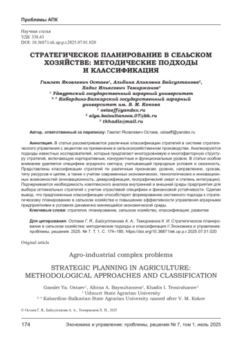 В статье рассматриваются различные классификации стратегий в системе стратегического управления с акцентом на применение в сельскохозяйственном производстве. Анализируются подходы известных исследователей, которые предлагают многоуровневую и многофакторную структуру стратегий, включающую корпоративные, конкурентные и функциональные уровни. В статье особое внимание уделяется специфике аграрного сектора, учитывающей природные условия и сезонность. Представлены классификации стратегий по различным признакам: уровню, направлению, срокам, типу ресурсов и целям, а также с учетом современных экономических, технологических и инновационных возможностей (инновационность, диверсификация, географический охват и степень интеграции). Подчеркивается необходимость комплексного анализа внутренней и внешней среды предприятия для выбора оптимальных стратегий с учетом отраслевой специфики и финансовой устойчивости. Сделан вывод, что предложенные классификации способствуют формированию системного подхода к стратегическому планированию в сельском хозяйстве и повышению эффективности управления аграрными предприятиями в условиях динамично меняющейся экономической среды.