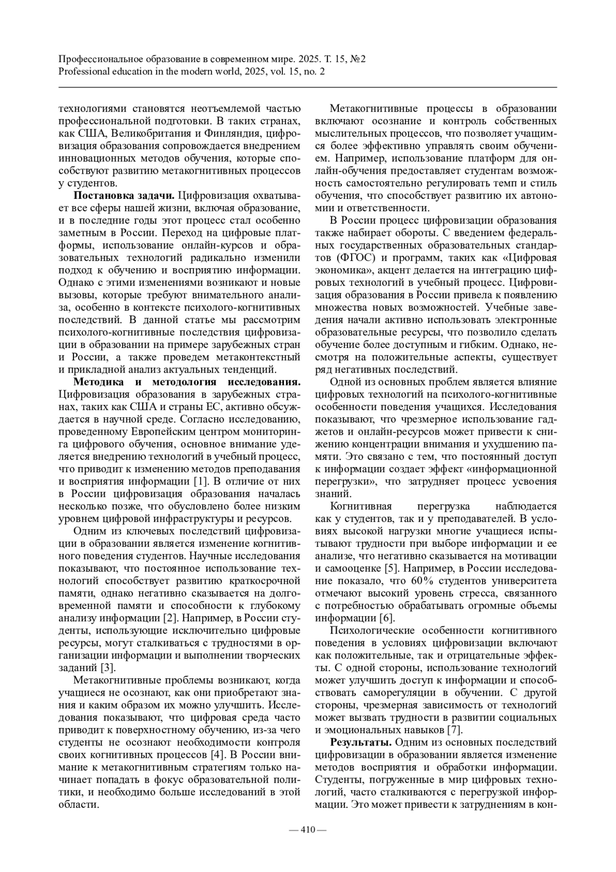 Метакогнитивные проблемы – это еще один важный аспект, который необходимо учитывать при анализе психолого-когнитивных последствий цифровизации. Метакогниция включает в себя осознание и регулирование собственных когнитивных процессов [8].