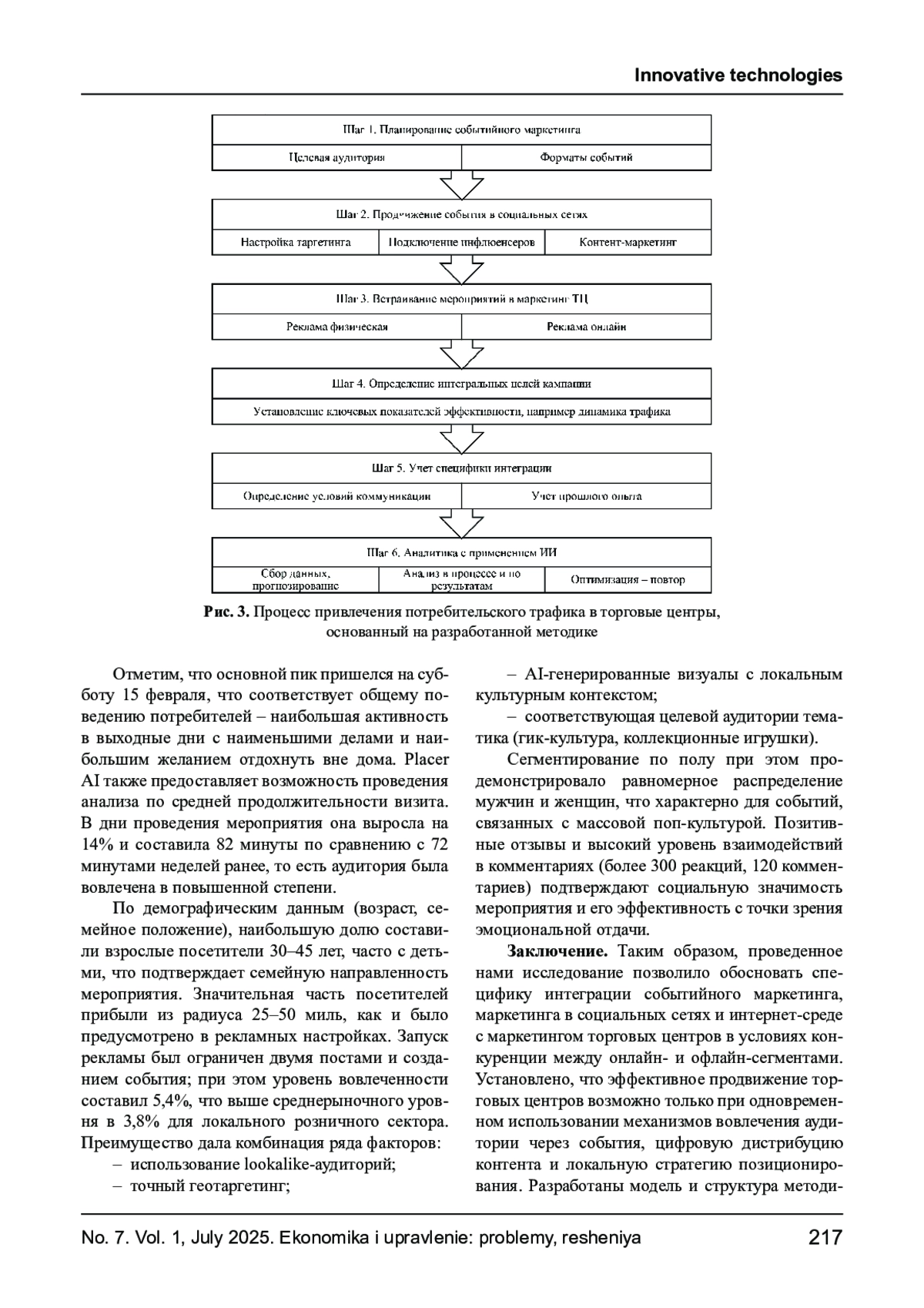 Статья посвящена рассмотрению теоретико-методологических и практико-ориентированных оснований разработки и апробации методики привлечения потребительского трафика в торговые центры на основе интеграции событийного маркетинга, маркетинга в социальных сетях и аналитических возможностей технологий искусственного интеллекта. Обосновывается актуальность исследования в условиях усиливающейся конкуренции между офлайн- и онлайн-средой, что определяет необходимость внедрения новых моделей взаимодействия с аудиторией. В рамках исследования раскрыта специфика событийного маркетинга как средства формирования эмоциональной связи между брендом и потребителем, его синергии с продвижением в социальных сетях, а также роль искусственного интеллекта (ИИ) в формировании персонализированного контента и таргетированной коммуникации. Выделяются структурные компоненты методики, предлагается авторская концептуальная модель и процессный алгоритм, позволяющие реализовать маркетинговые активности с учетом поведения, когнитивных и эмоциональных характеристик целевой аудитории. Практическая апробация разработанной методики проведена на примере торгового центра Northwoods Mall (г. Пеория, США) с использованием платформы Placer AI. В результате реализации события Peoria Comic & Toy Show и его целевого продвижения в социальных сетях зафиксирован рост посещаемости на 42,8% по сравнению с предыдущими выходными и на 6,8% по сравнению с аналогичным периодом прошлого года. Отмечено увеличение средней продолжительности визита на 14%. Эмпирические данные подтверждают жизнеспособность разработанного подхода. Научная новизна исследования заключается в обосновании и интеграции событийного и цифрового маркетинга с инструментами ИИ в рамках продвижения офлайн-пространств. Теоретическая значимость проявляется в систематизации и уточнении принципов интегративного маркетинга торговых центров в условиях цифровизации, основанного на элементах событийного маркетинга и продвижения в социальных сетях с использованием технологий искусственного интеллекта. Практическая значимость заключается в предложении воспроизводимой методики, применимой для различных объектов.