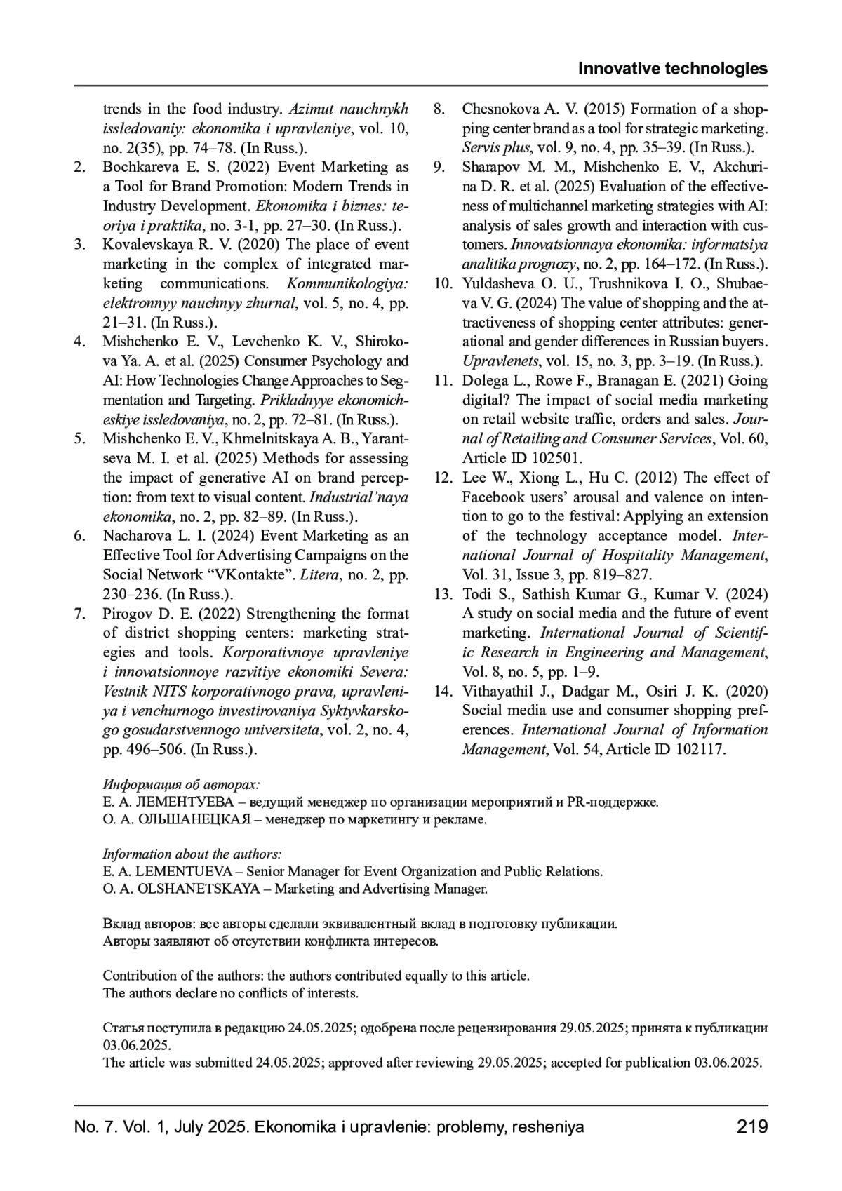 9. Шарапов М. М., Мищенко Е. В., Акчурина Д. Р. и др. Оценка эффективности мультиканальных маркетинговых стратегий с ИИ: анализ прироста продаж и взаимодействия с клиентами // Инновационная экономика: информация аналитика прогнозы. 2025. № 2. С. 164-172. EDN: ONVDXK
