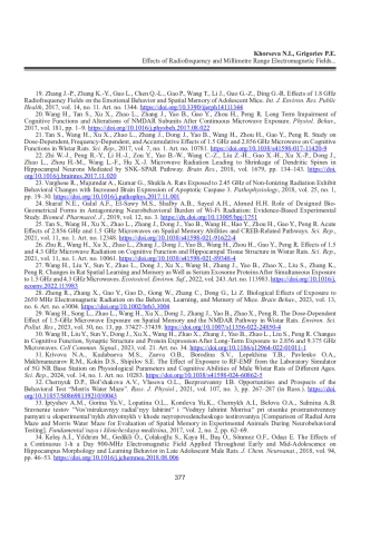 42. Qin T.-Z., Wang X., Du J.-Z., Lin J.-J., Xue Y.-Z., Guo L., Lai P.-P., Jing Y.-T., Zhang Z.-W., Ding G.-R. Effects of Radiofrequency Field from 5G Communications on the Spatial Memory and Emotionality in Mice // Int. J. Environ. Health Res. 2024. Vol. 34, No 1. P. 316-327. DOI: 10.10/09603123.2022.2149708
