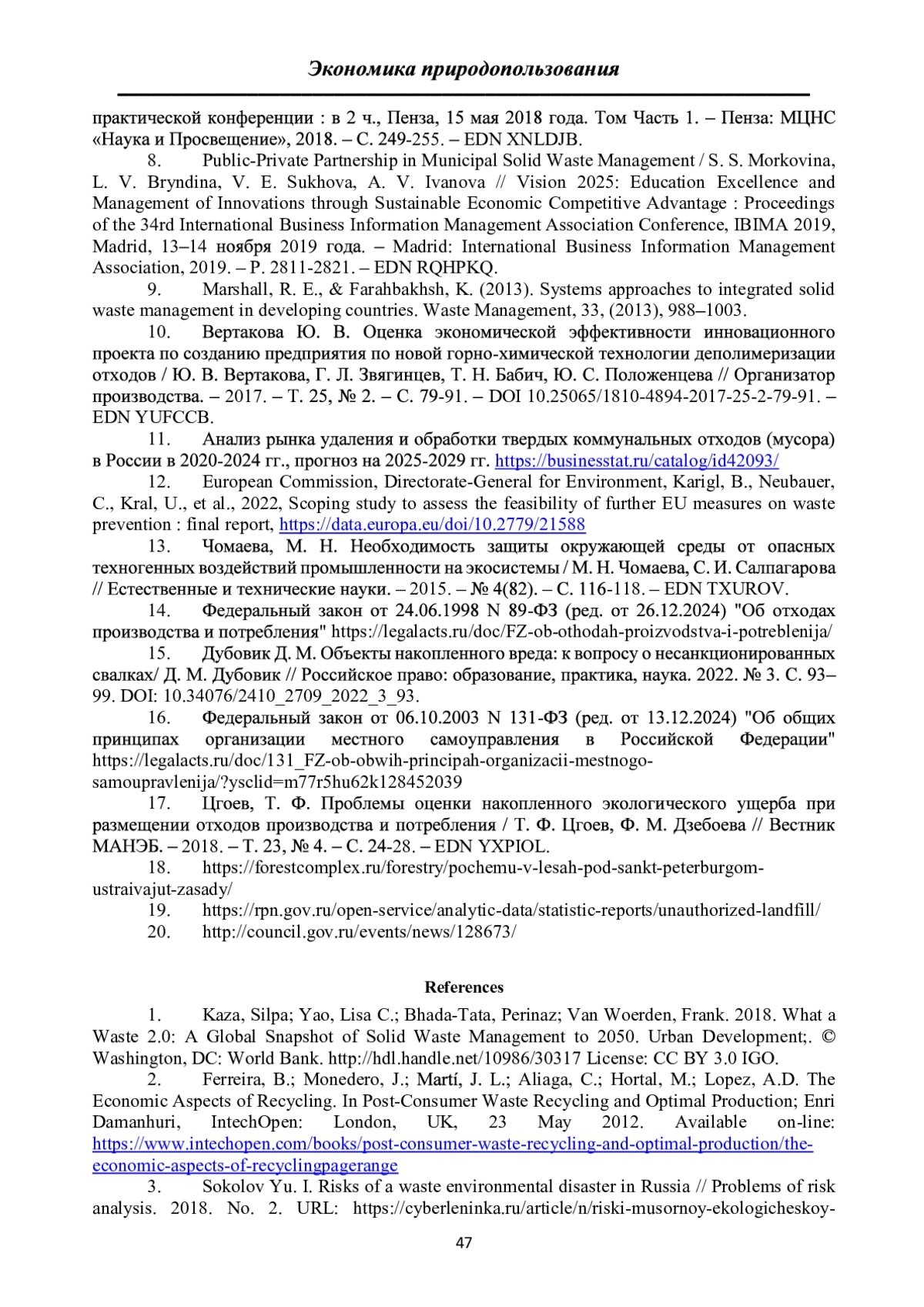 3. Соколов Ю. И. Риски мусорной экологической катастрофы России // Проблемы анализа риска. 2018. №2. URL: https://cyberleninka.ru/article/n/riski-musornoy-ekologicheskoy-katastrofy-rossii (дата обращения: 08.02.2025).