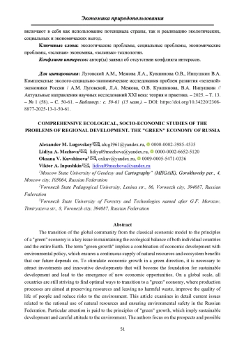 Переход мирового сообщества от классической экономической модели к принципам «зеленой» экономики является ключевым вопросом сохранения экологического баланса как отдельных стран, так и всей Земли. Термин «зеленый рост» подразумевает сочетание экономического развития с экологической политикой, что обеспечивает непрерывное снабжение природными ресурсами и экосистемными преимуществами, на которые возлагается наше будущее. Чтобы стимулировать экономический рост в зеленом направлении, необходимо привлекать инвестиции и инновационные разработки, которые станут фундаментом для устойчивого развития и приведут к возникновению новых экономических возможностей. В мировом масштабе все страны по-прежнему стремятся найти оптимальные пути для перехода к «зеленой» экономике, где производственные процессы направленны на сохранение ресурсов и не оставляющие вредных отходов, улучшают качество жизни людей и уменьшают риски для окружающей среды. В данной статье подробно рассматриваются актуальные вопросы, связанные с рациональным использованием природных ресурсов и обеспечением экологической безопасности на территории Российской Федерации. Особое внимание уделяется принципам «зеленого» роста, которые предполагают устойчивое развитие и бережное отношение к окружающей среде. Авторы акцентируют внимание на перспективах и возможных направлениях для эффективного внедрения данной концепции в рамках региональной политики России. Переход к «зеленой экономике» является сложным и многогранным процессом, который требует комплексного подхода и тесной взаимосвязи всех мероприятий направленных на достижение конкретных целей, которые включают в себя как использование потенциала страны, так и реализацию экологических, социальных и экономических выгод.